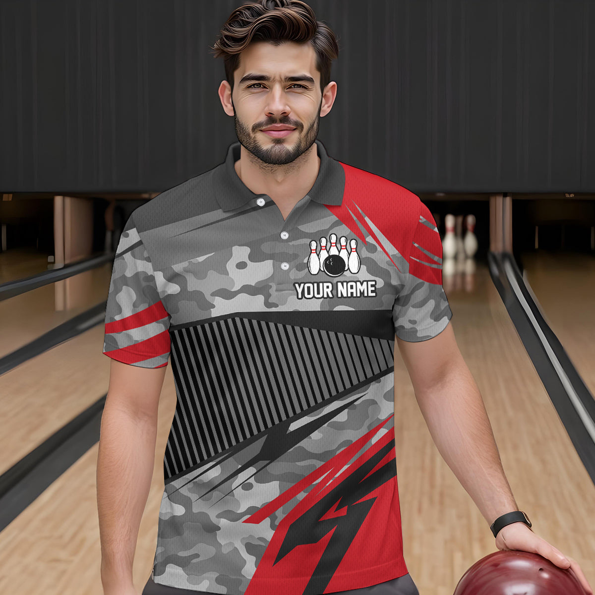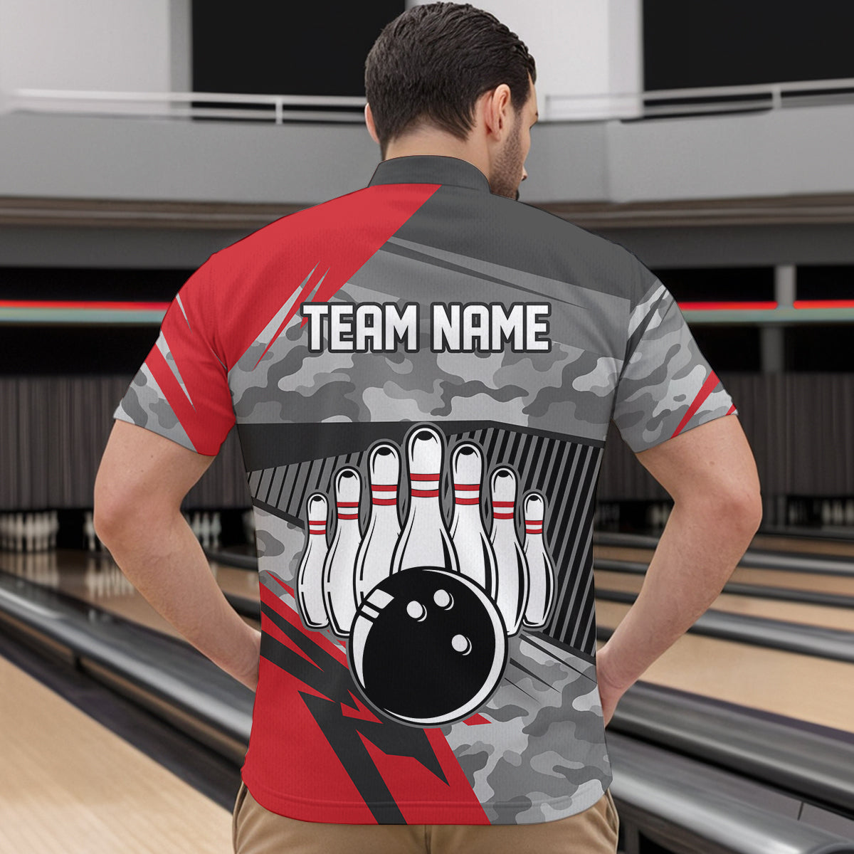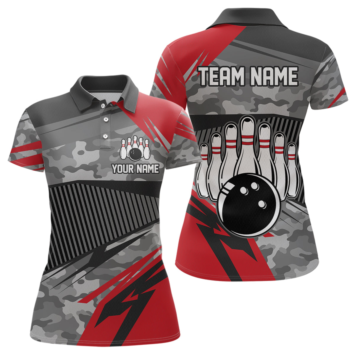 Red Camo Bowling Shirts for Women Men Custom Team Bowling Polo & 1/4 Zip Shirt MBL61