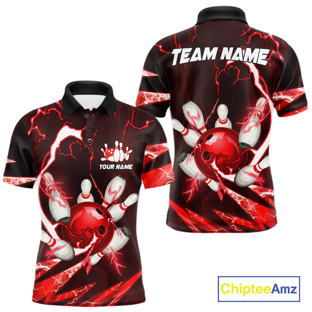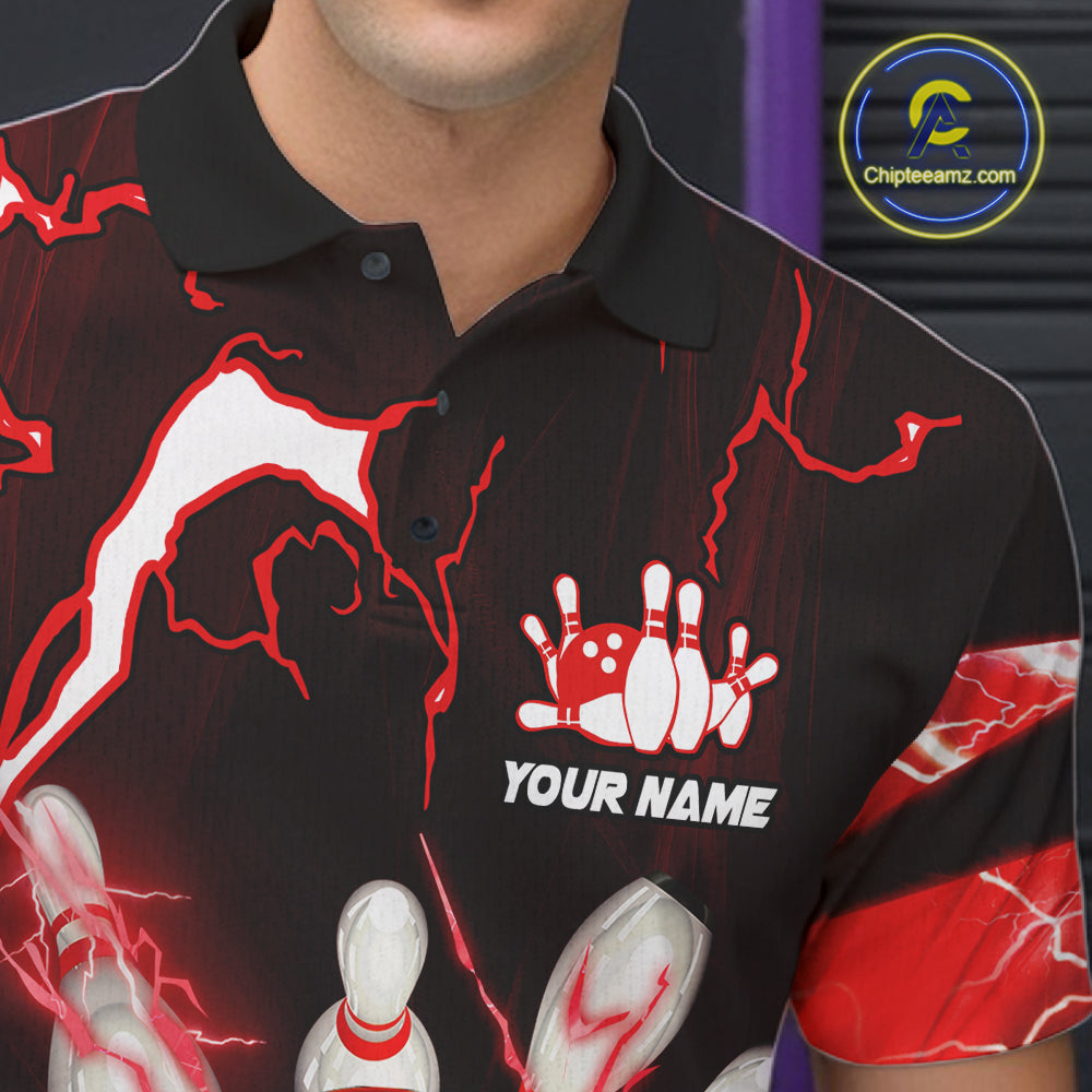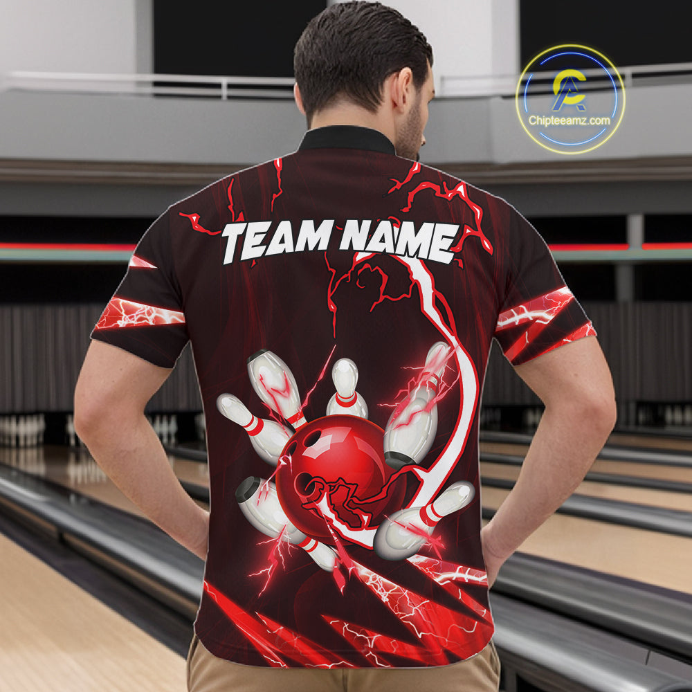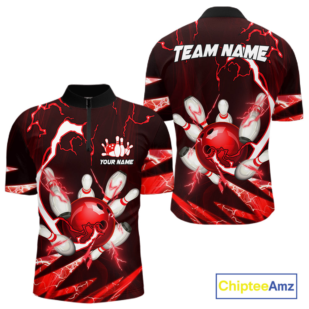 Red Thunder Lightning bowling ball and pins jerseys Custom Team Bowling Polo, 1/4 Zip Shirts For Men NQS11281