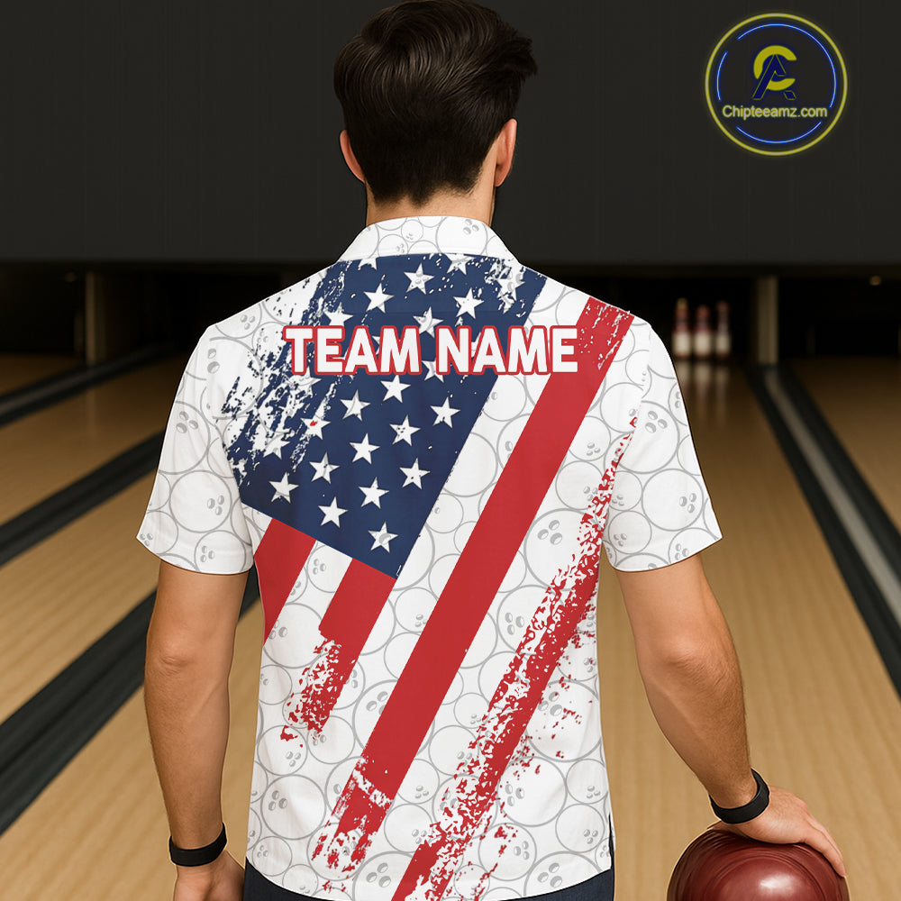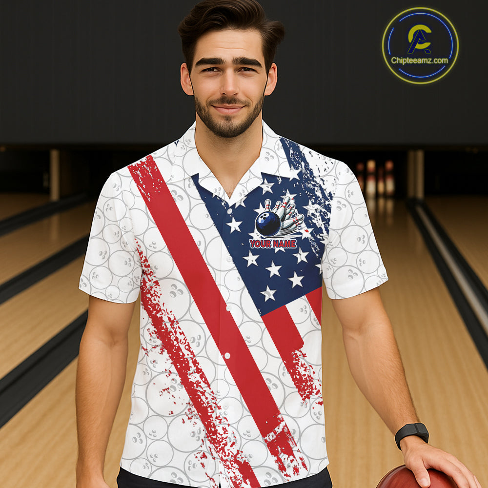 Red, white & blue American Flag Bowling Hawaiian Shirt Custom patriotic Bowling Team Button up shirt NQS11292