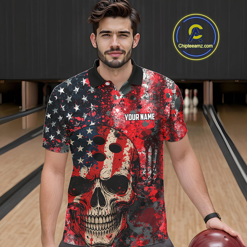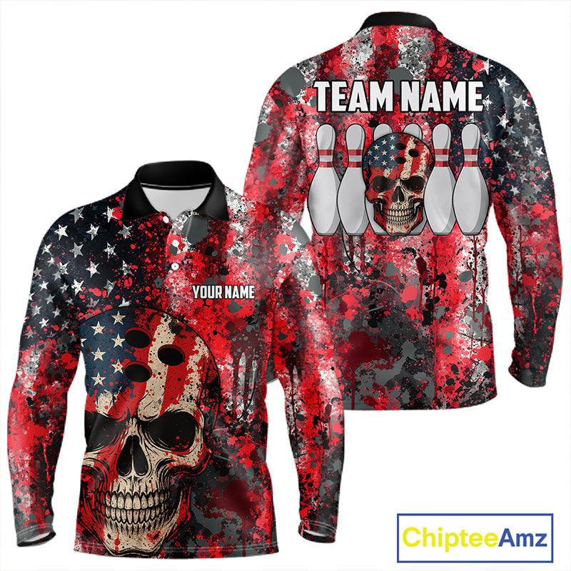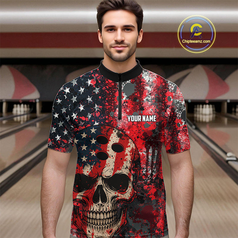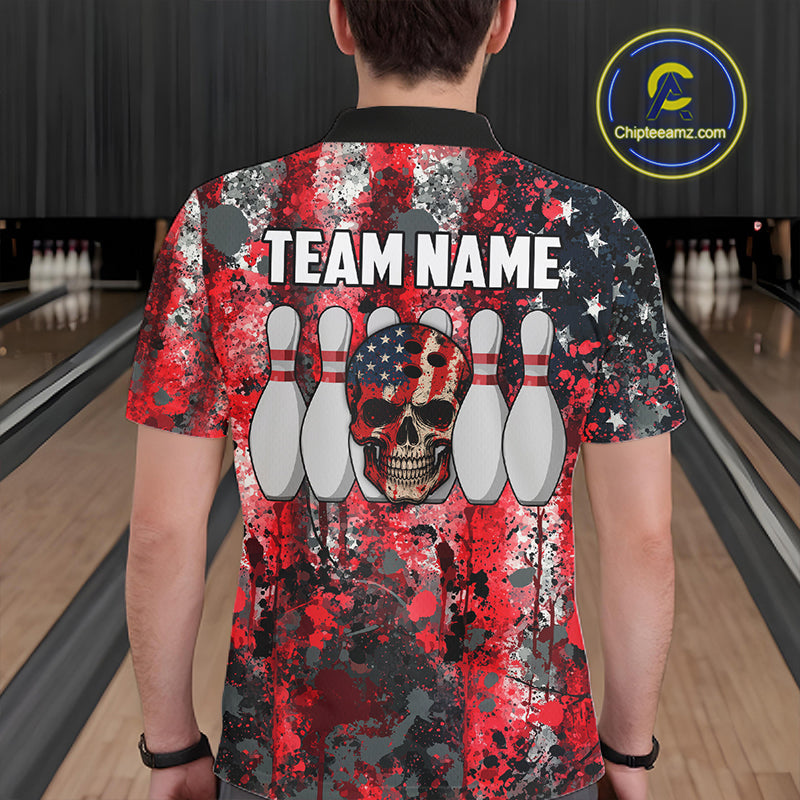 Red, White & Blue American Flag Skull Bowling shirts For Men Custom patriotic Team Bowling Jersey NQS11275