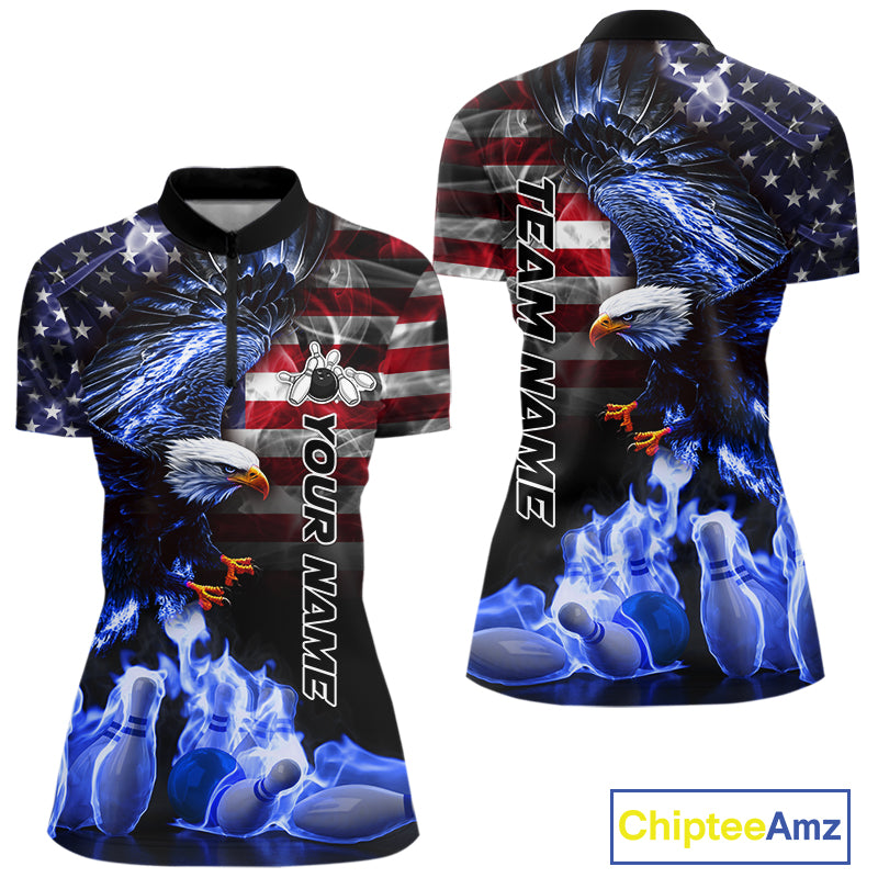 Smoke American Flag Eagle Blue Flame Bowling Shirts for Women Custom patriotic Team Bowling jerseys NQS10868
