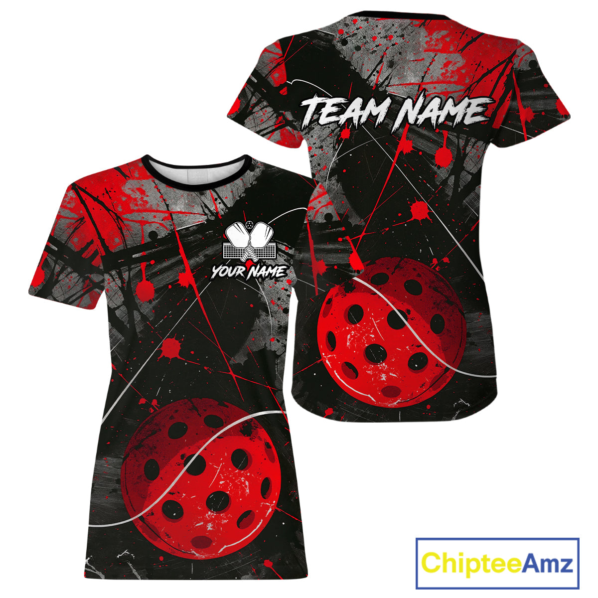 Custom Black Grunge Red Pickleball Ball T-Shirt For Women Splatter Pickleball Jerseys NYN2481