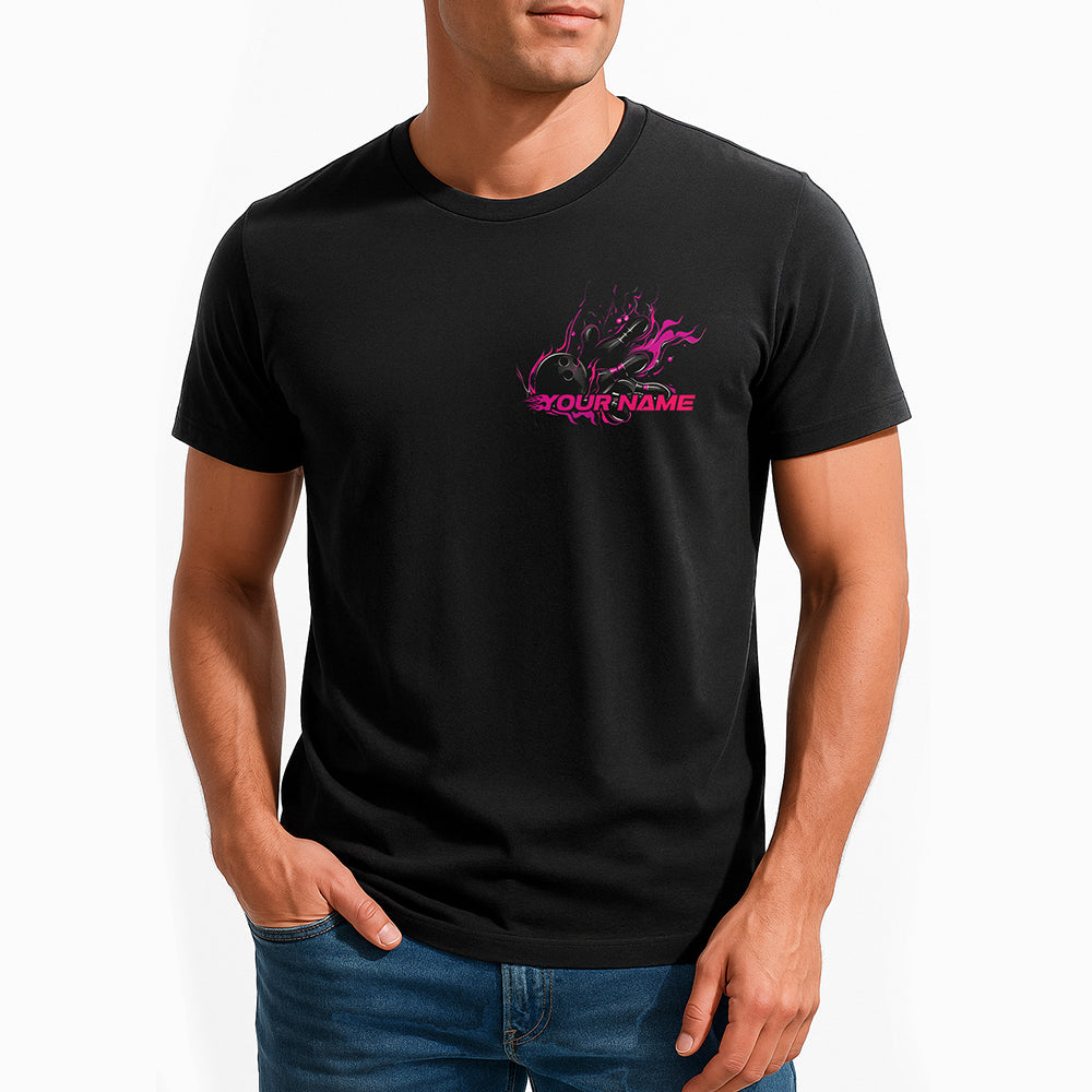 Custom Black And Pink Flame Strike Bowling T-Shirts For Men, Team Outfit IPHW9056