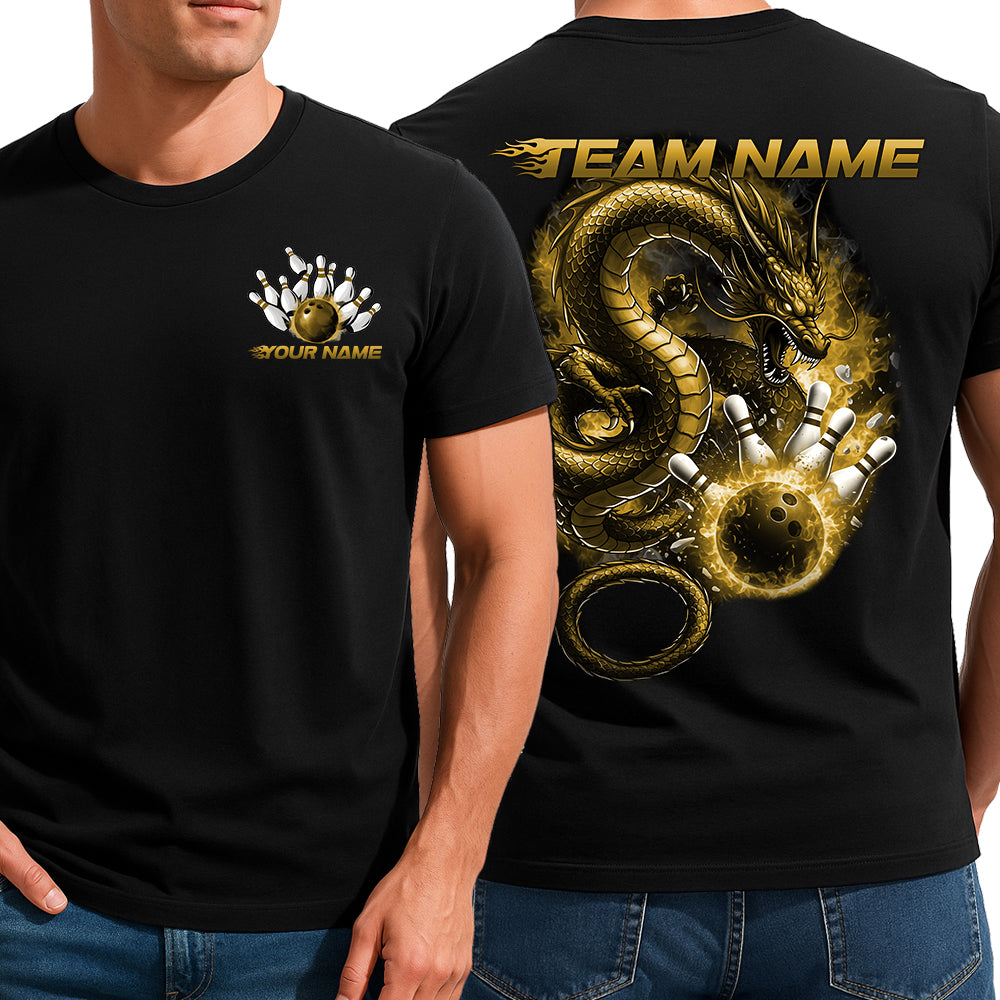 Custom Flame Dragon Bowling T-Shirts For Men, Yellow Fire Bowling Ball Graphics IPHW9067