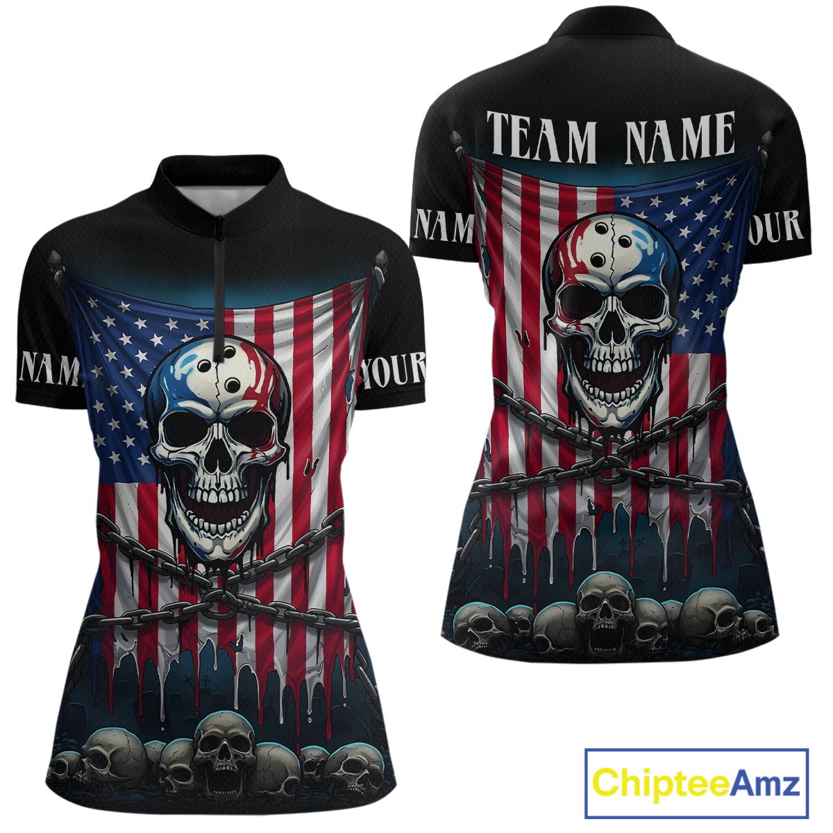 US Flag Skull Bowling Custom Women Bowling Shirt Polo & Quarter-Zip Bowling Team Shirts HNT74