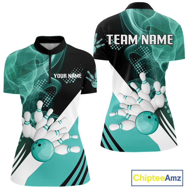 Women bowling polo, 1/4 zip shirts Custom cyan blue smoke bowling team jerseys, gift for Bowlers NQS10060