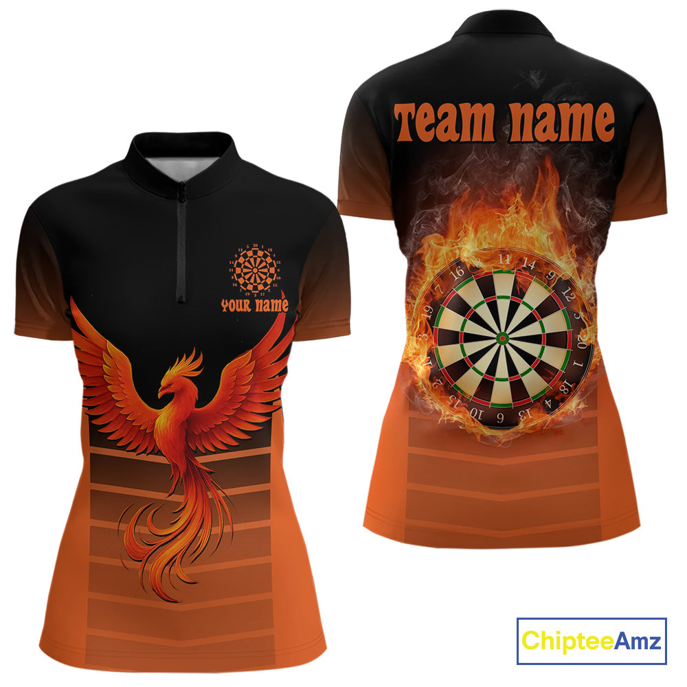 Women's Custom Darts Shirt With Amber Phoenix And Flame Dartboard, Darts Jersey NYN0261