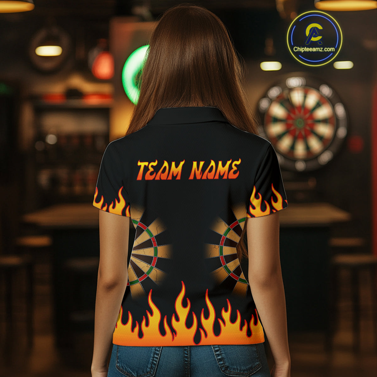 Women's Personalized Darts Shirt With Black Flame Pattern And Fiery Dartboard NYN0265