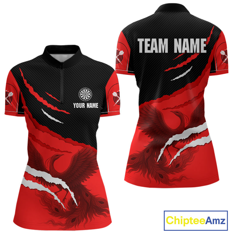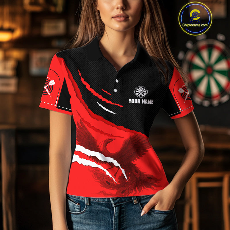 Custom Dart Team Shirt For Women With Crimson Phoenix On Black Linear Pattern NYN0277