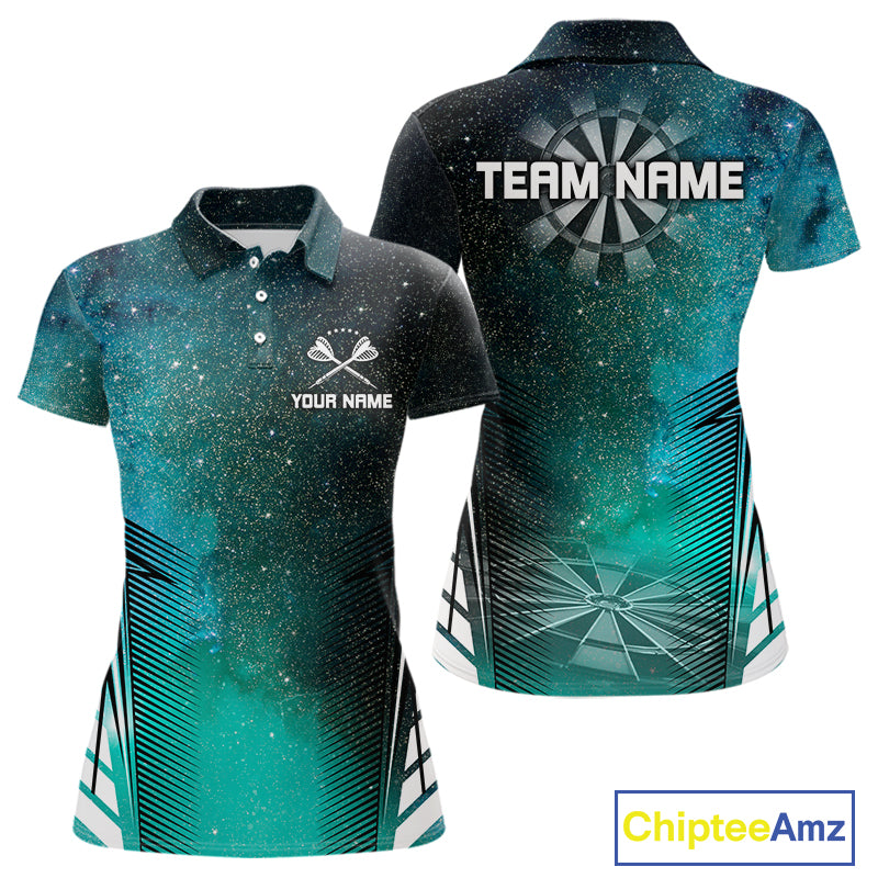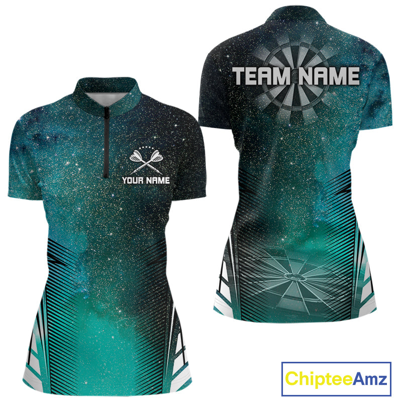 Custom Women's Darts Team Shirt With Cosmic Teal Gradient & Abstract Dartboards NYN0287
