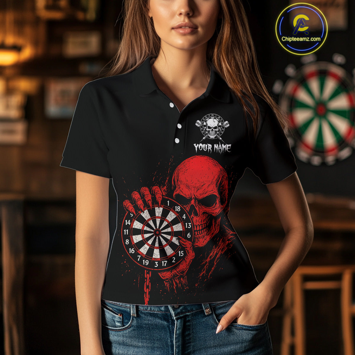 Custom Women's Darts Shirt With Blood Skull Holding Dartboard, Darts Jersey NYN0294