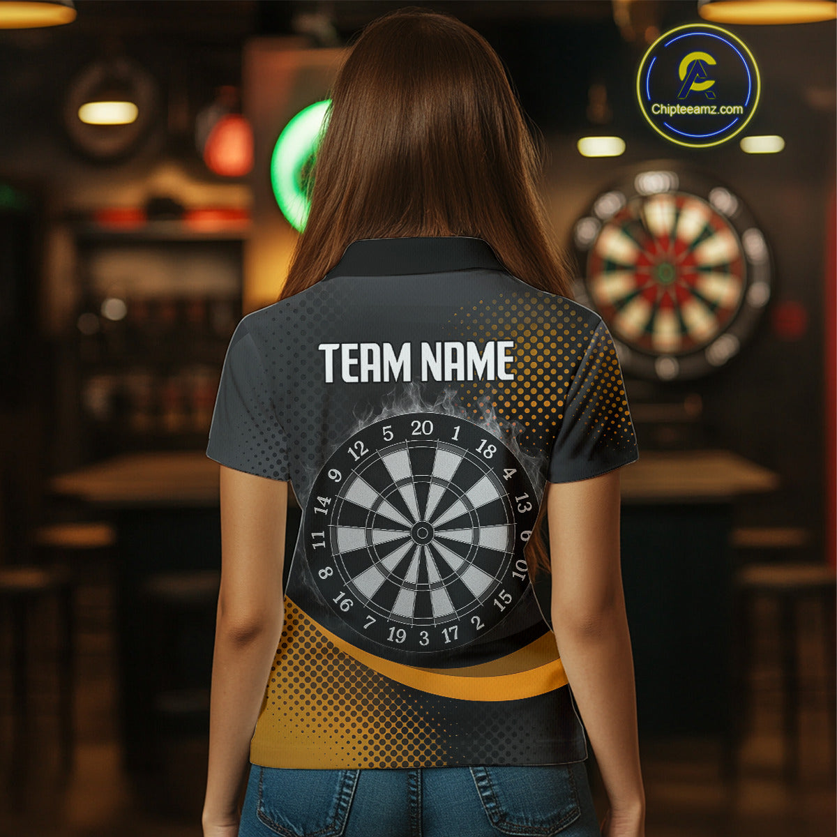 Custom Women’s Darts Shirt, Pearl Eagle With Yellow Halftone And Smoky Dartboard NYN0302