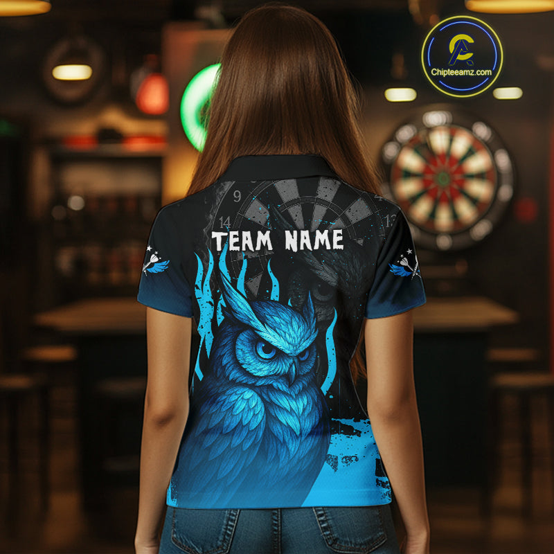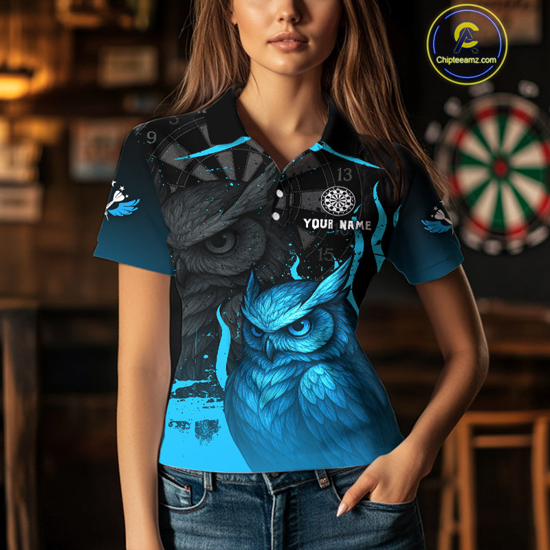 Women’s Darts Shirt With Navy Owl And Grunge Dartboard, Custom Name Option NYN0305