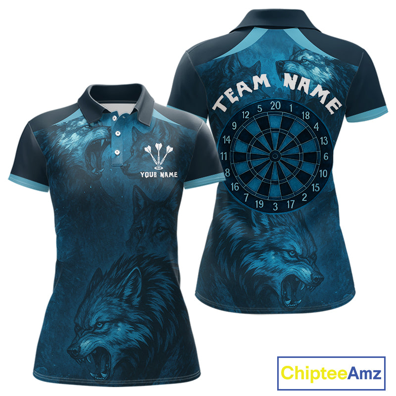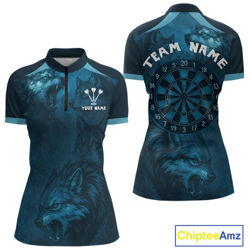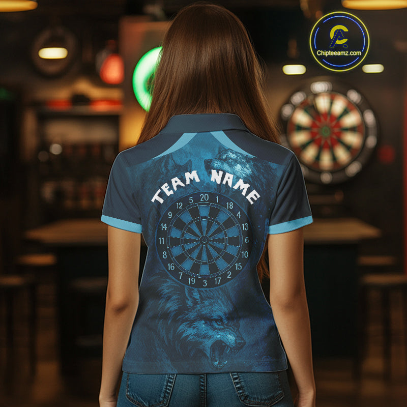 Women’s Team Darts Shirt With Dark Navy Wolves And Grunge Dartboard Pattern NYN0306