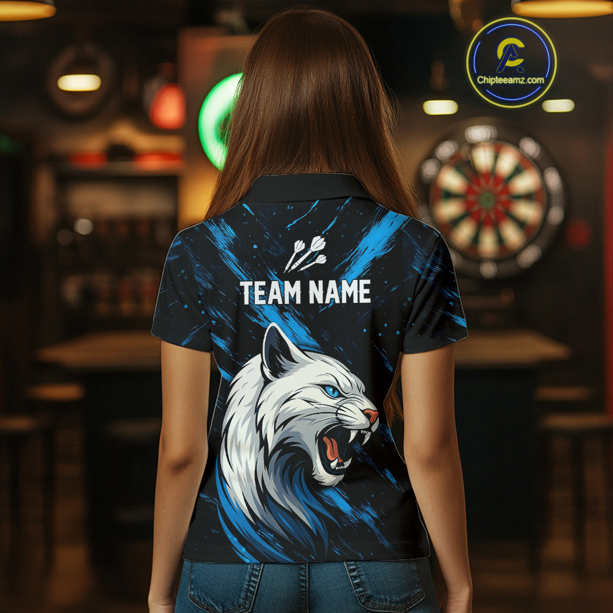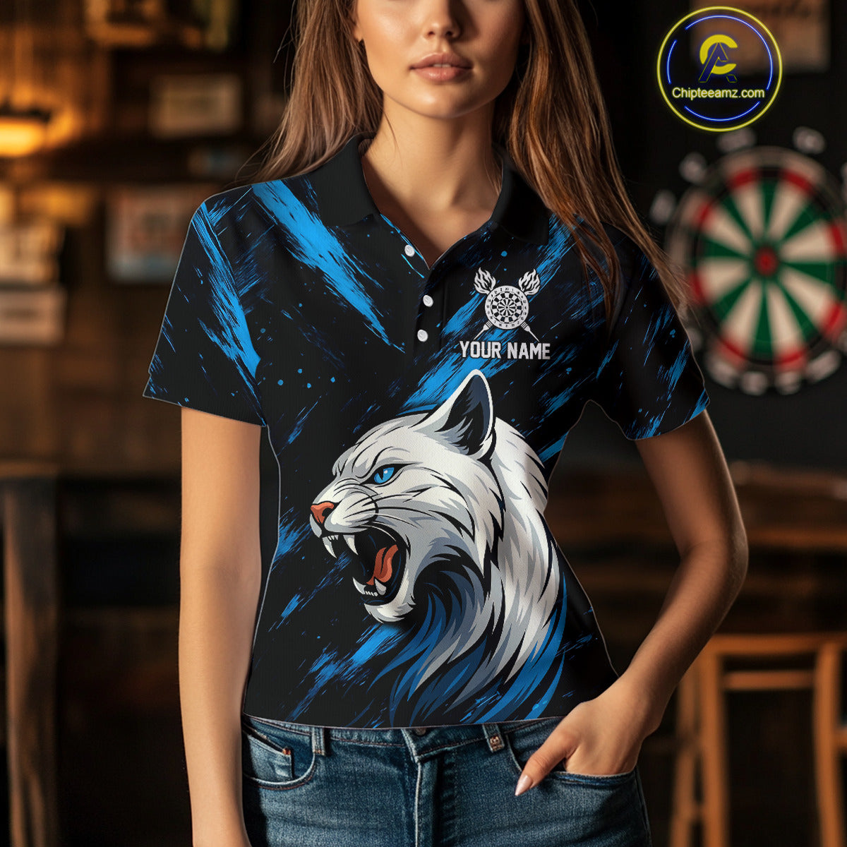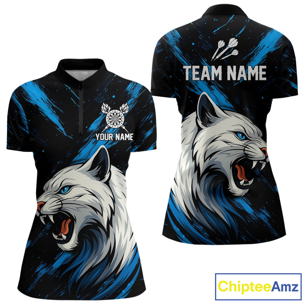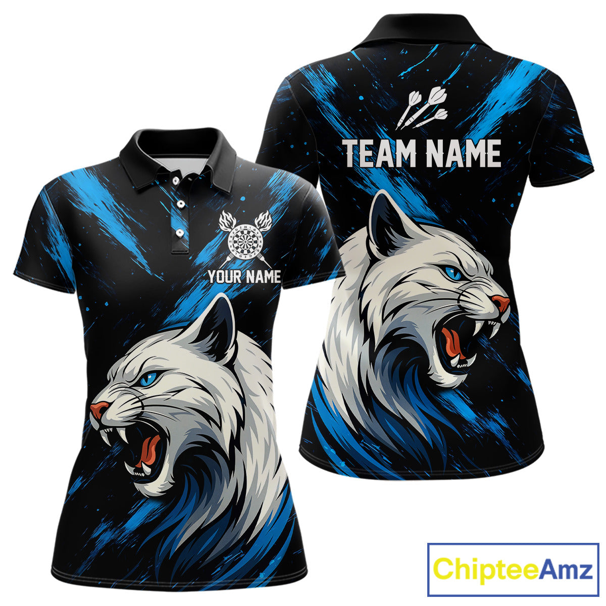 Women's Custom Darts Shirt - Ivory Panther With Dartboard & Blue Grunge Pattern NYN0331