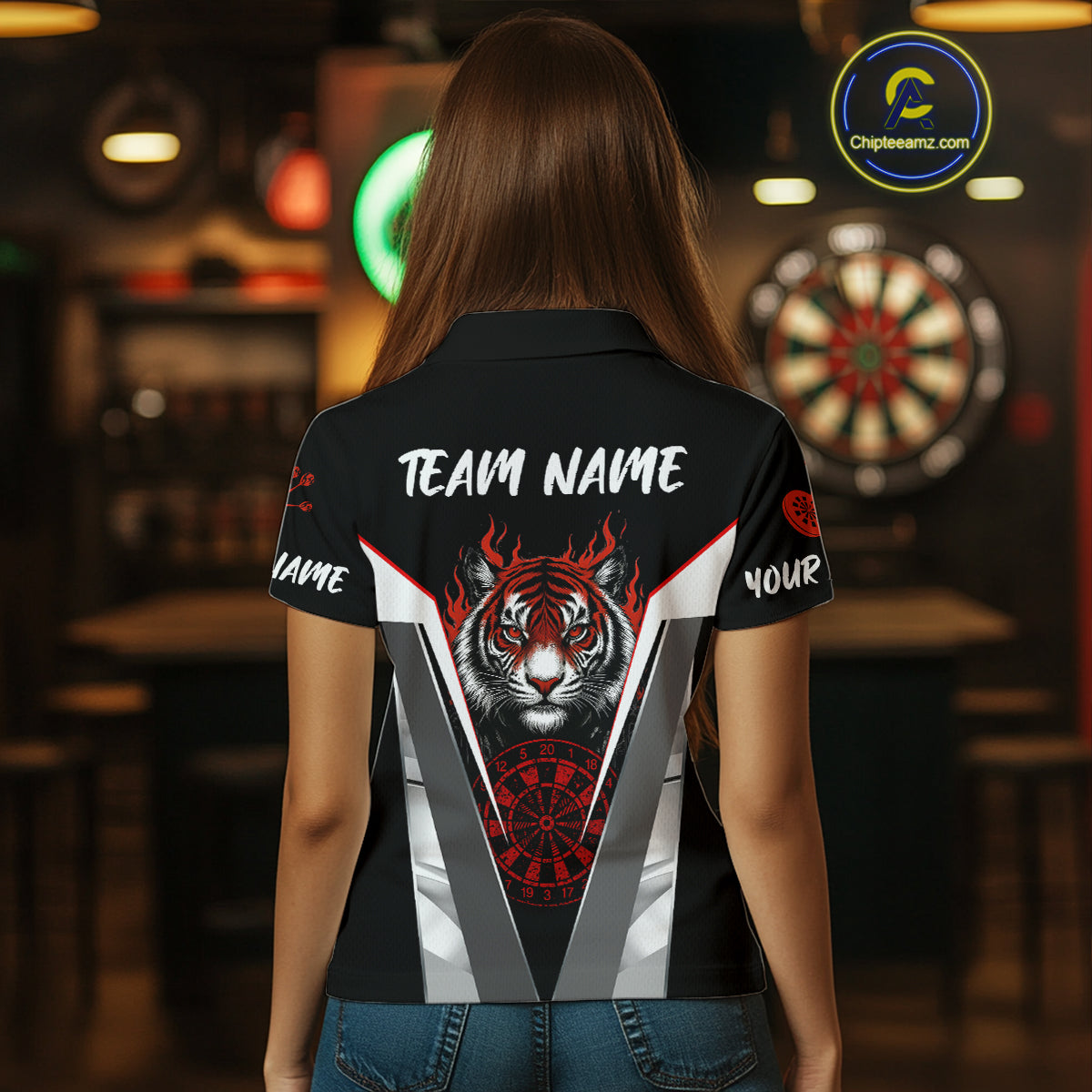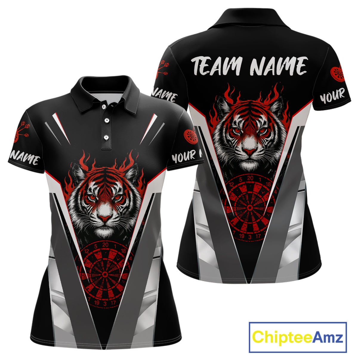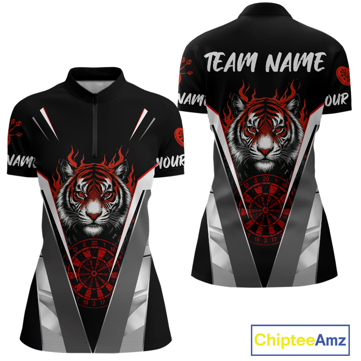 Custom Women's Dart Team Shirt With Roaring Tiger Dartboard - Silver & Black Jersey NYN0337