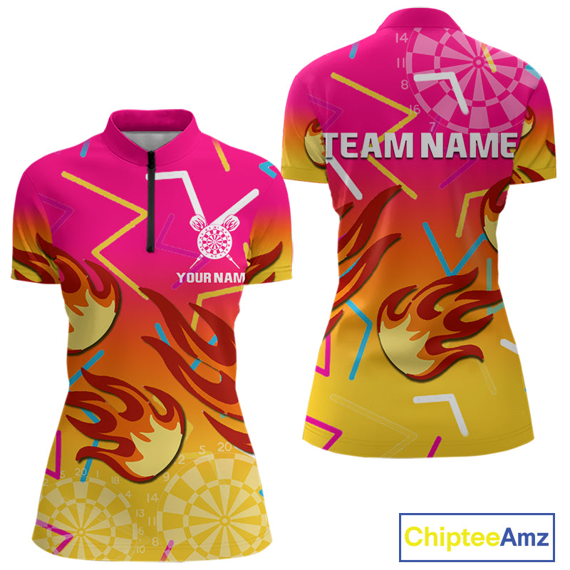 Flames In Vibrant Pink & Yellow Darts Funny Shirt For Women - Custom Team Name NYN0373