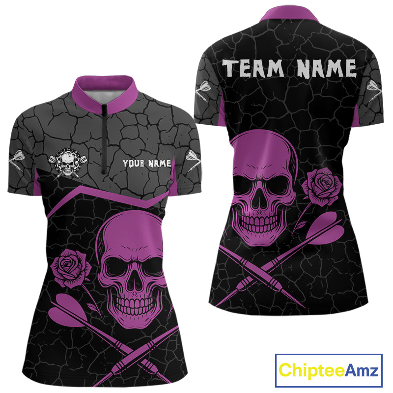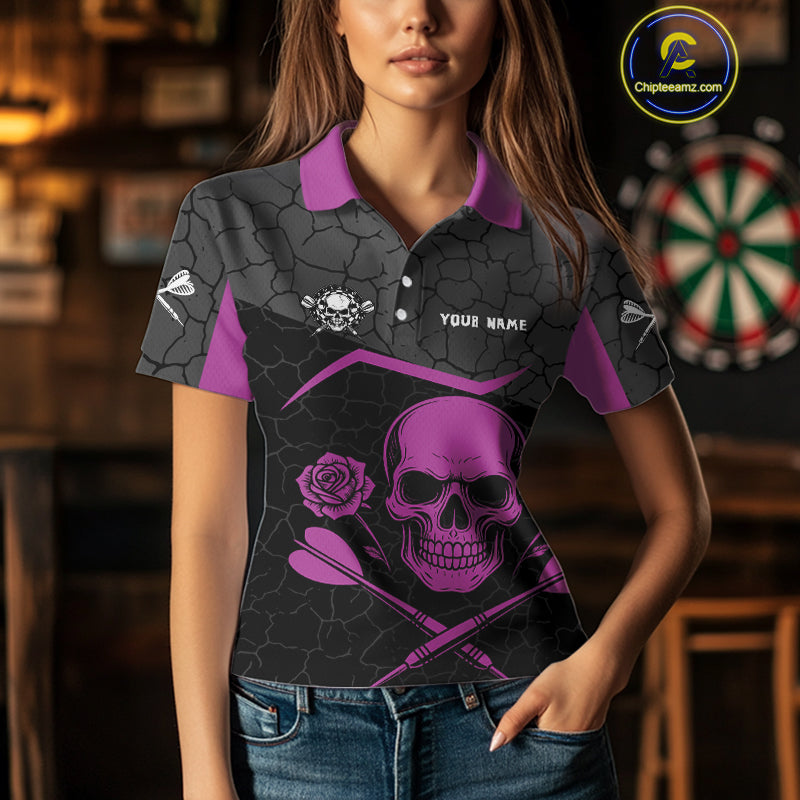Purple Roses Skull & Black Cracked Pattern Darts Shirt For Women - Custom Team Name NYN0375