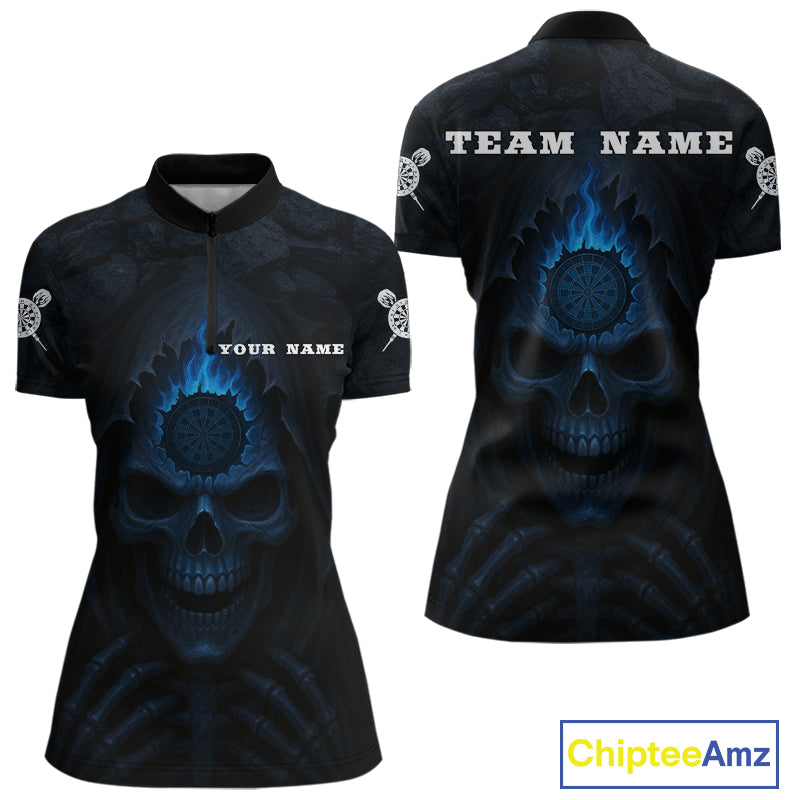 Blue Flaming Dartboard In Grim Reaper Women's Team Shirt - Custom Name For Darts Jersey NYN0514