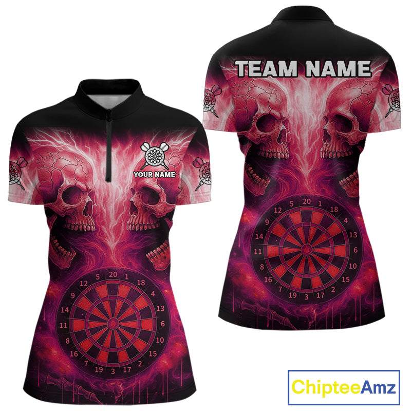 Electric Red Skulls & Dartboard Darts Shirt For Women - Custom Dart Player Jersey NYN0540