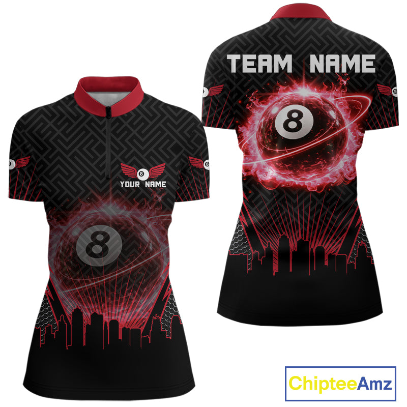 Black & Red Flaming 8 Ball Light Women's Billiard Shirts Personalized Billiard Team Attire NYN2329
