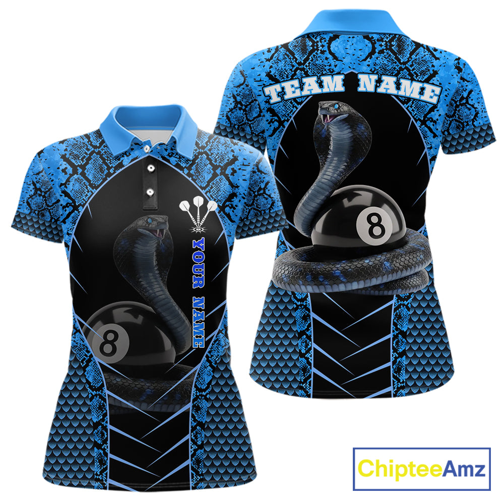Personalized Cobra Snake Women Billiard Team Shirt Blue 8 Ball Billiard Polo & 1/4 Zip Attire NYN2365
