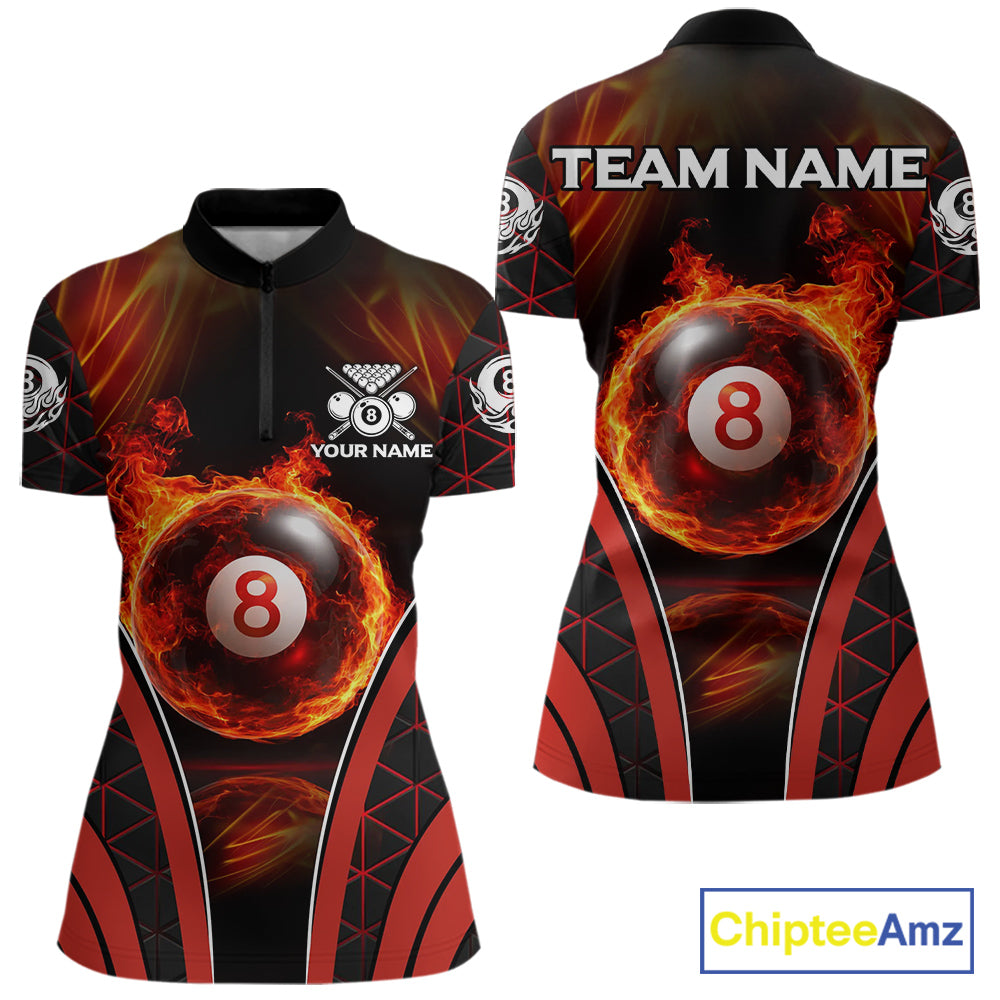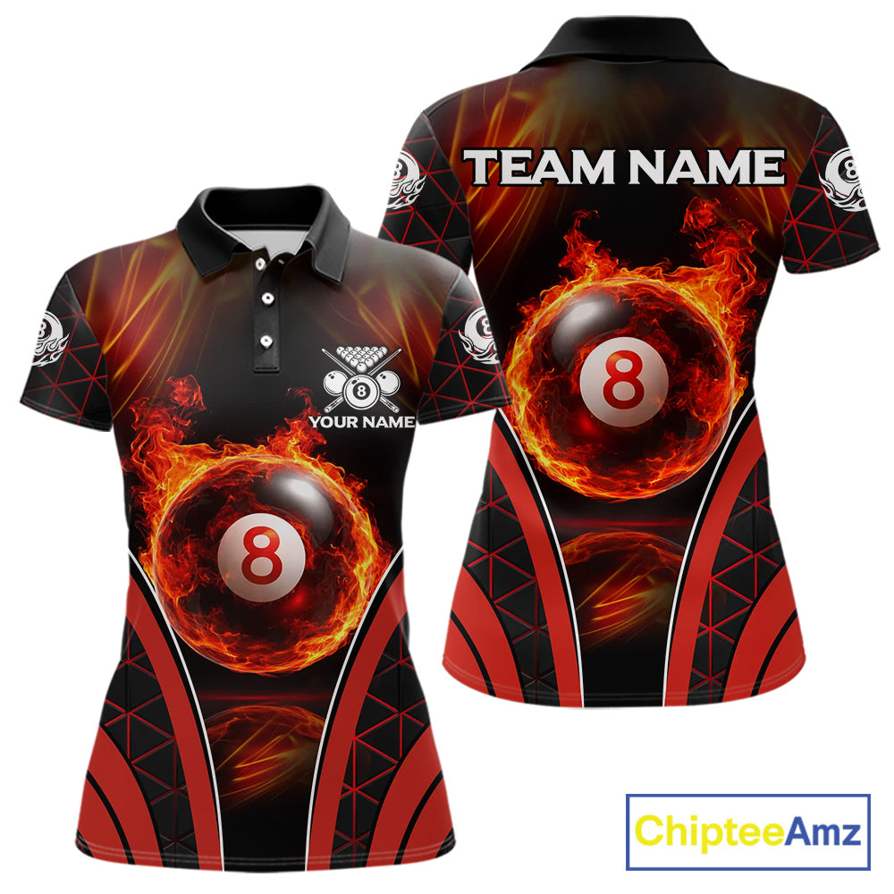 Red Flames Pool 8 Ball Women Billiard Polo & 1/4-Zip Shirts Custom Billiard Team Shirt Designs NYN2404