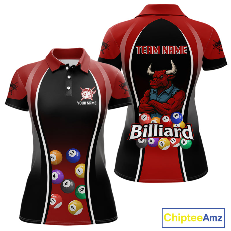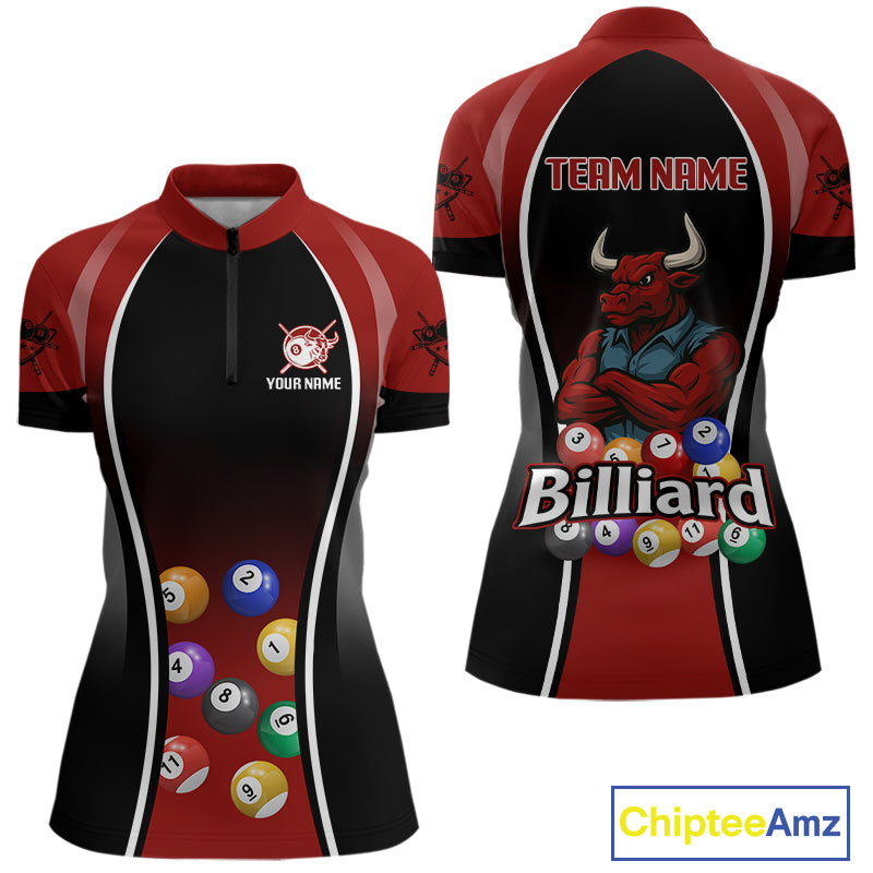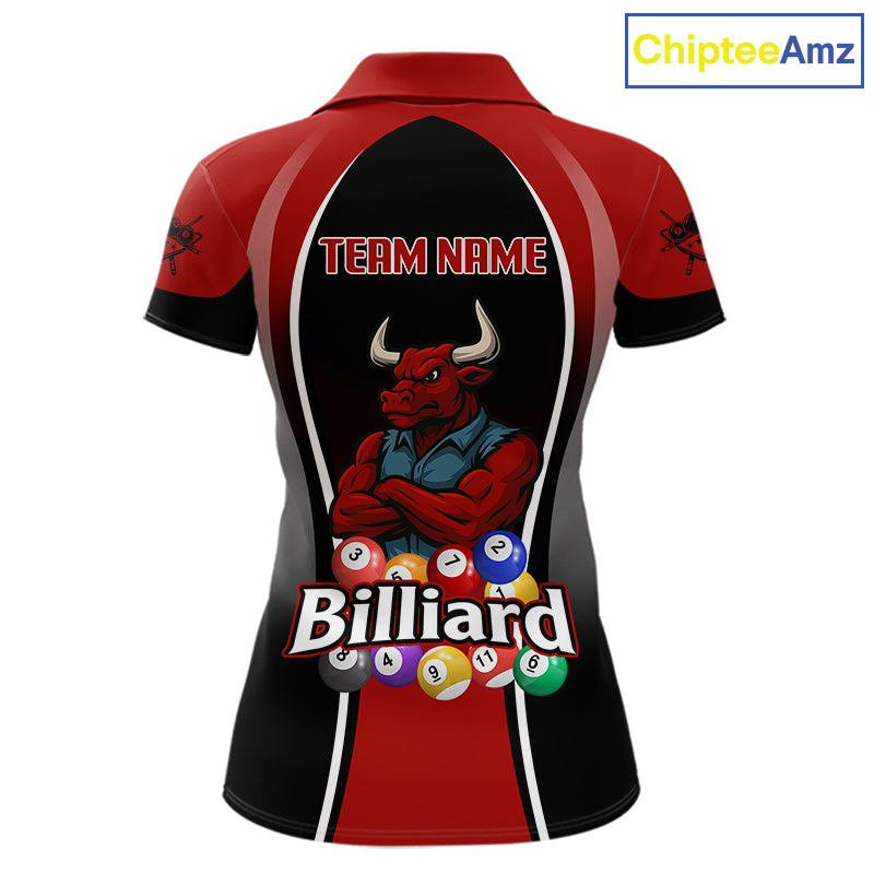 Red Funny Bull Pool Balls Women Billiard Polo & 1/4-Zip Apparel Custom Billiard Shirt Designs NYN2408