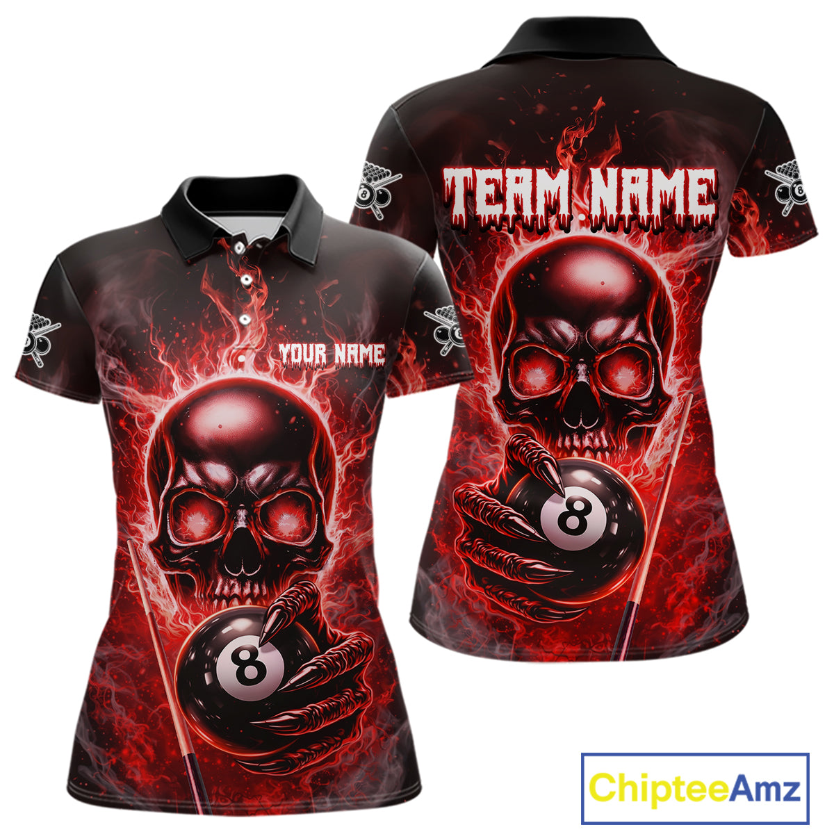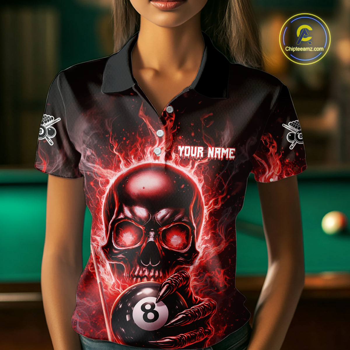 Red Flames Skull Hoding 8 Ball Pool Women Polo & 1/4-Zip Shirt Custom Billiards Ball Jerseys NYN2428