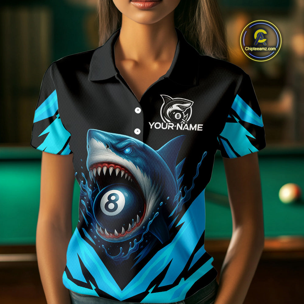 Personalized Blue 8 Ball Pool Billiard Shark Polo & 1/4 Zip For Women, Billiard Team Pool Jerseys TDM4013