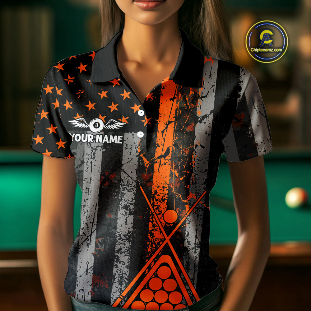 Custom Orange Grunge US Flag Patriotic Billiard Shirts For Women, Retro 8 Ball Pool Billiard Jersey TDM4046