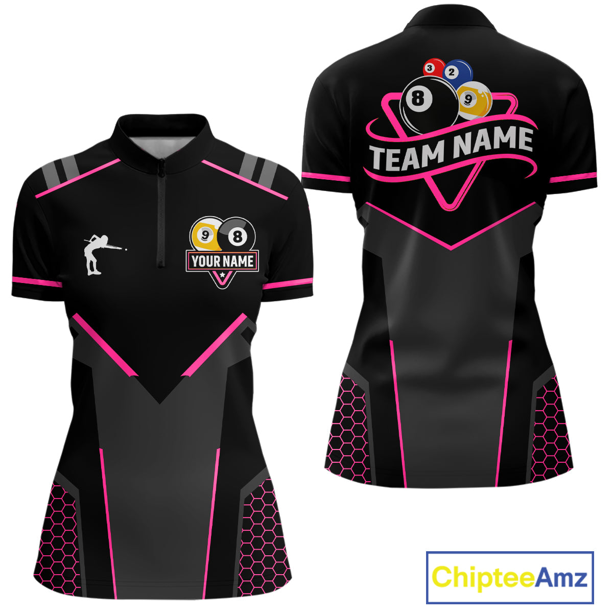 Personalized 8 Ball & 9 Ball Pool Billiard Polo, 1/4 Zip For Women Custom Team Billiard Jersey|Pink TDM4048