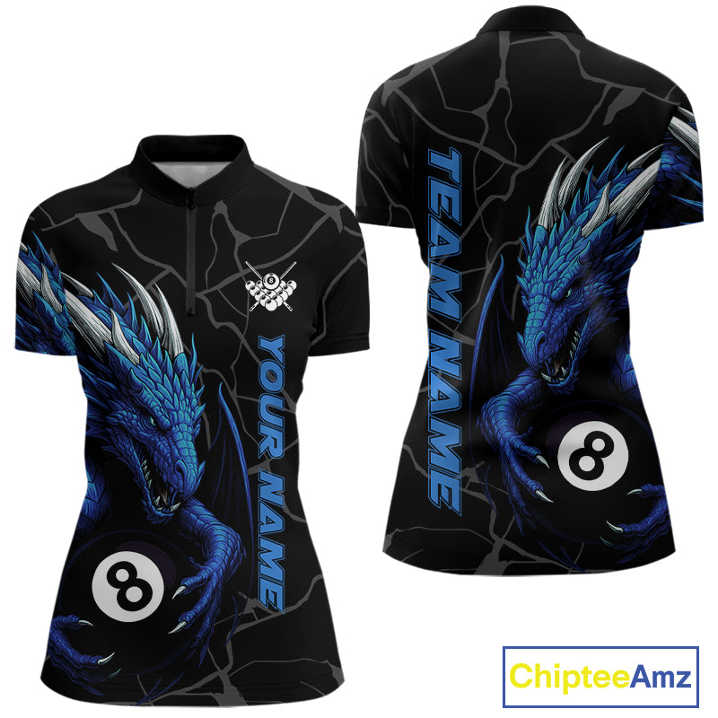 Custom Women's Dragon Billiard Shirt – Black And Blue 8 Ball Pool Team Jersey Polo & Quarter Zip TDM4064