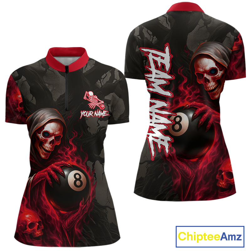 Grim Reaper Custom Flame 8 Ball Pool Billiard Shirt For Women, Black And Red Billiard Team Jerseys TDM4120