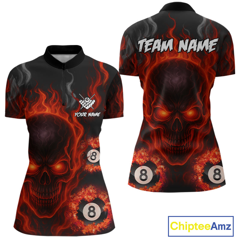 Red Flaming Skull 8 Ball Billiard Shirt For Women Custom Pool Jerseys Team Polo & Quarter Zip TDM4136