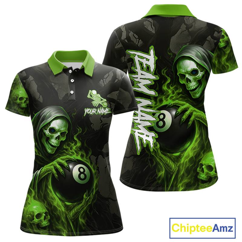 Grim Reaper Custom Flame 8 Ball Pool Billiard Shirt For Women, Black And Green Billiard Team Jersey TDM5532