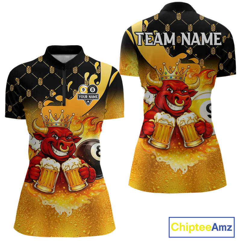 Funny Bull And Beer 8 Ball 9 Ball Billiard Shirt For Women Custom Billiard Team Jersey Polo, 1/4 Zip TDM5646