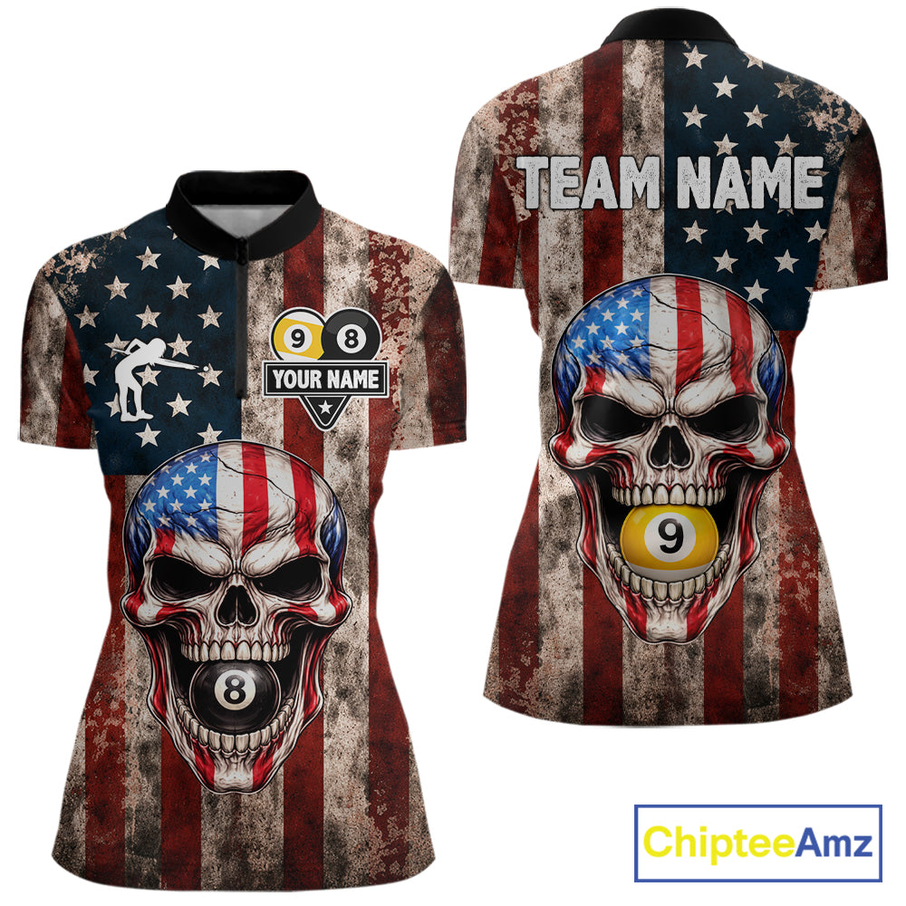 Vintage American Flag Skull 8 Ball 9 Ball Billiard Shirt For Women Custom Patriotic Pool Team Jersey TDM5656