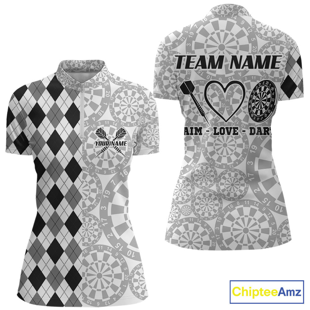 Aim Love Darts Custom Black Argyle Women Darts Polo & 1/4 Shirt, Funny Darts Shirts Dart Team Jersey TDM5662
