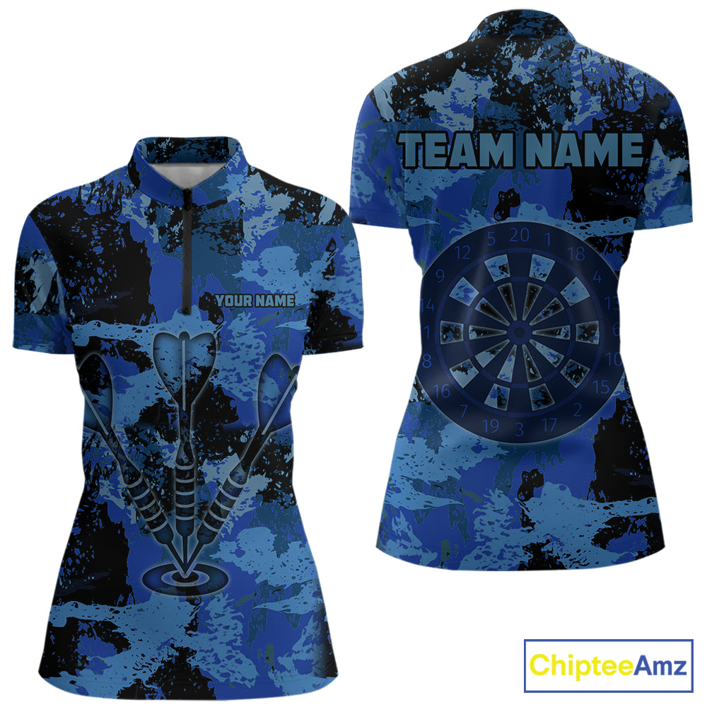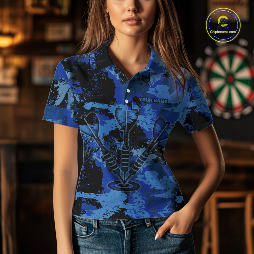 Custom Grunge Blue Camo Arrow Darts Shirts For Women, Retro Darts Jersey Team Polo & 1/4 Zip TDM5664