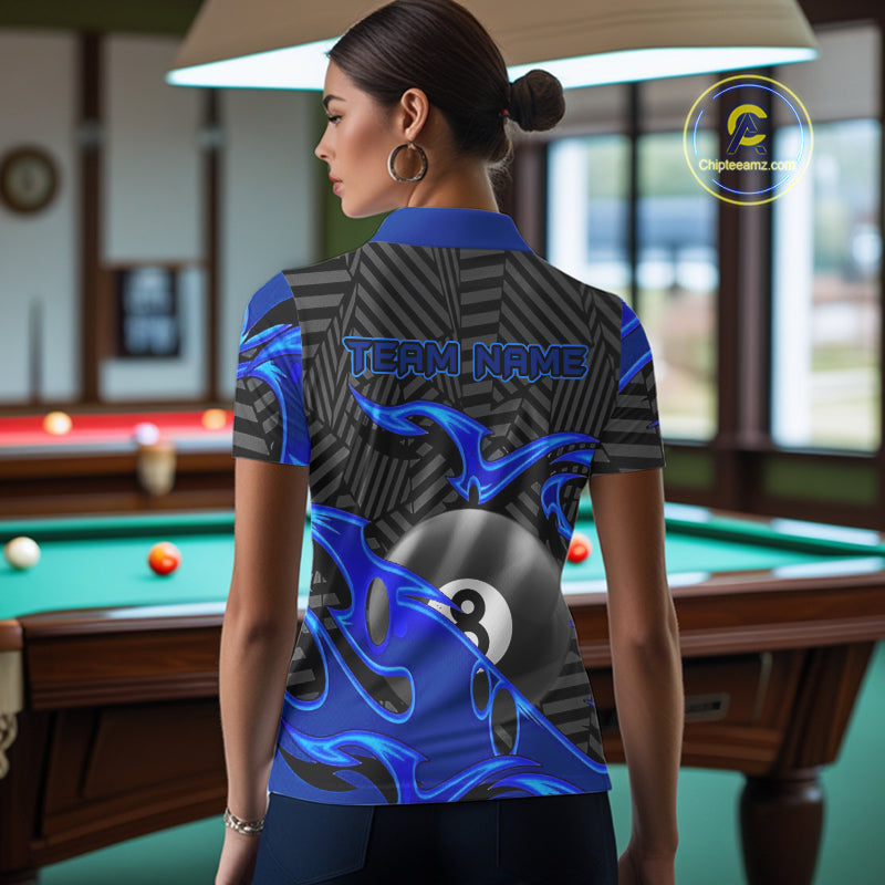 Custom Black And Blue 8 Ball Tribal Flame Billiard Shirt For Women, Pool Team Jersey Polo & 1/4 Zip TDM5724