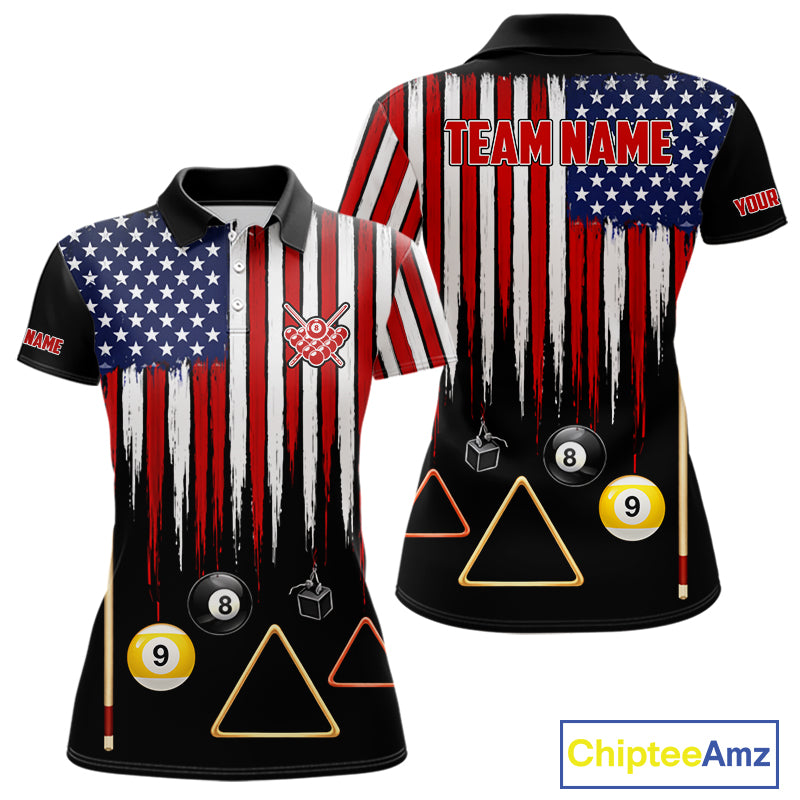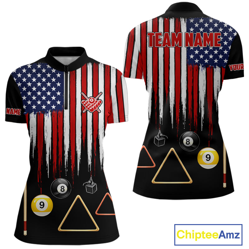 American Flag Billiard Shirt For Women Custom Patriotic Pool Team Jersey Polo & 1/4 Zip |Black TDM5752