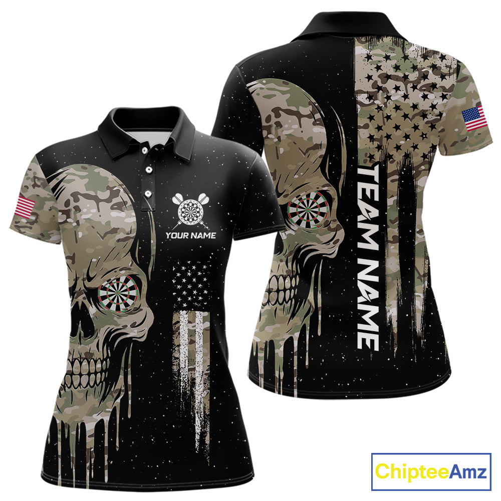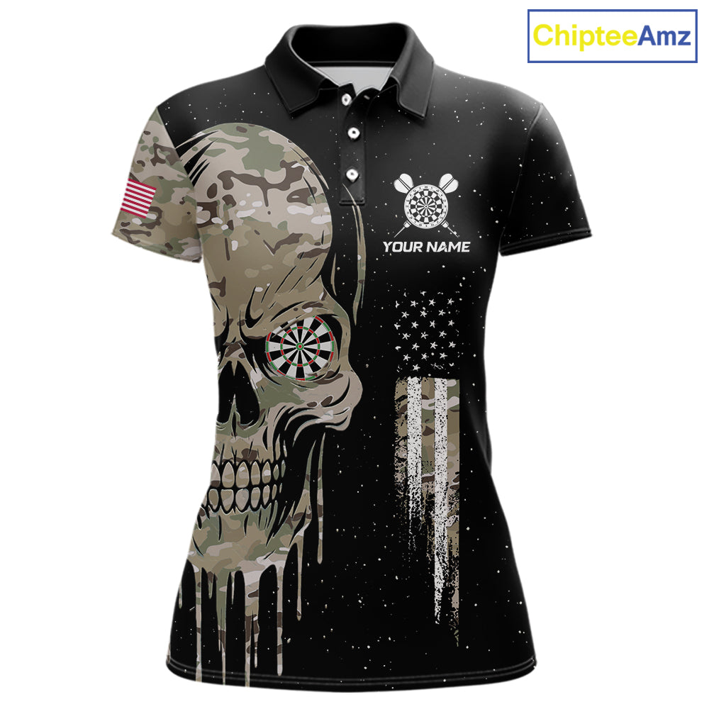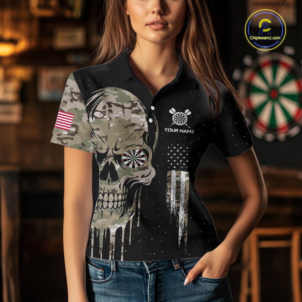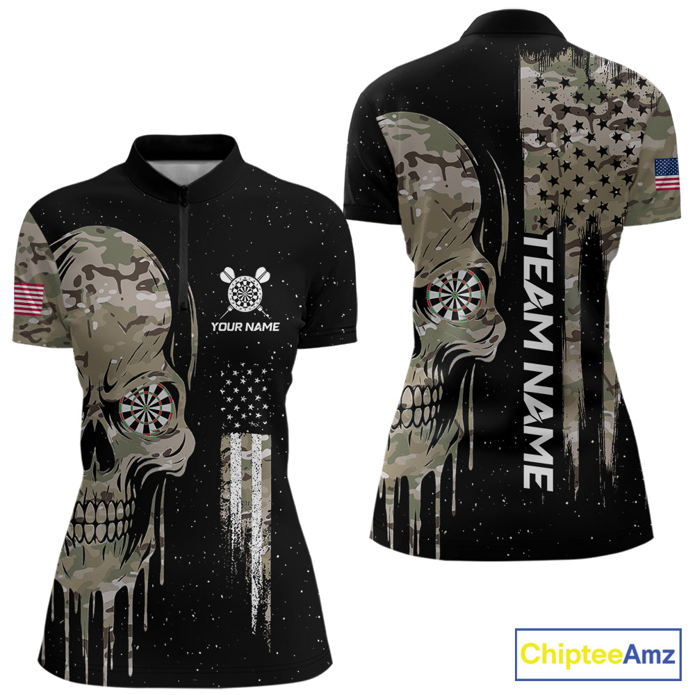Black Grunge Camo Skull US Flag Dart Shirt For Women Custom Patriotic Dart Jersey Team Polo, 1/4 Zip TDM5773