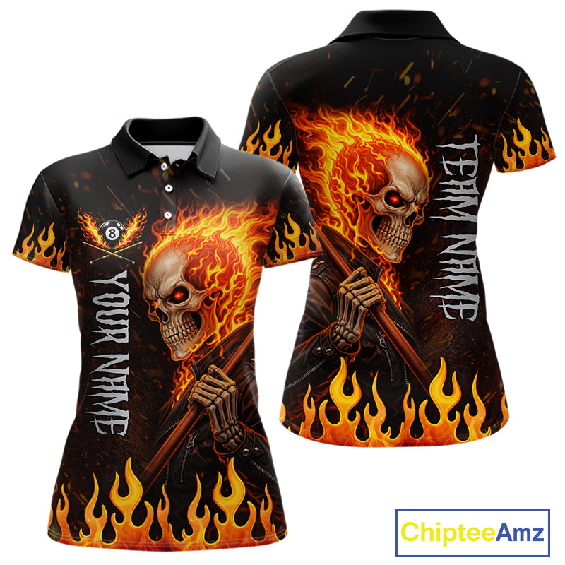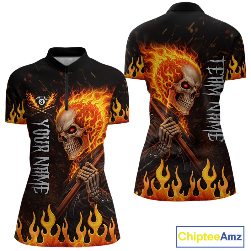 Personalized Orange Flaming Skeleton 8 Ball Billiard Shirt For Women, Pool Team Jersey Polo, 1/4 Zip TDM5781