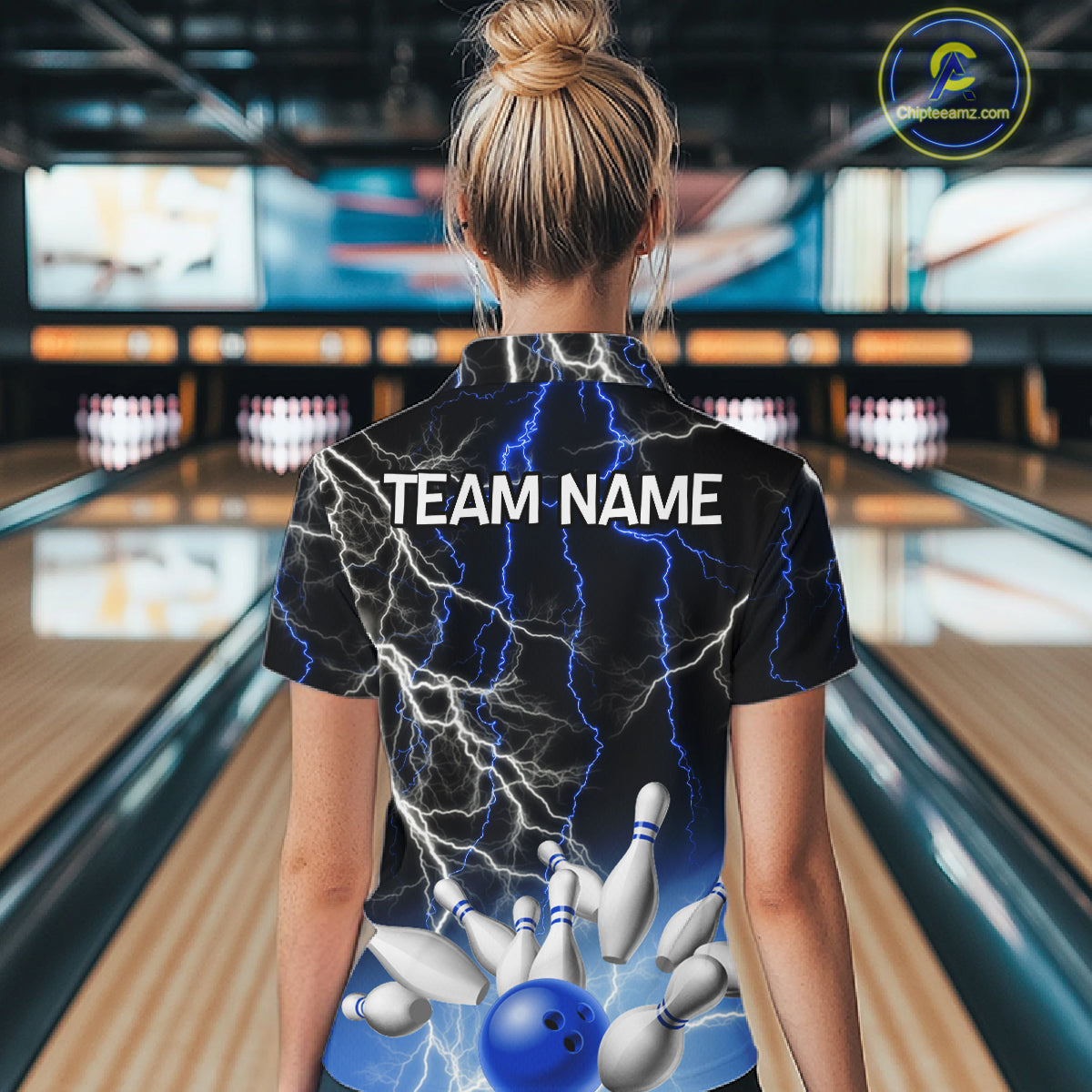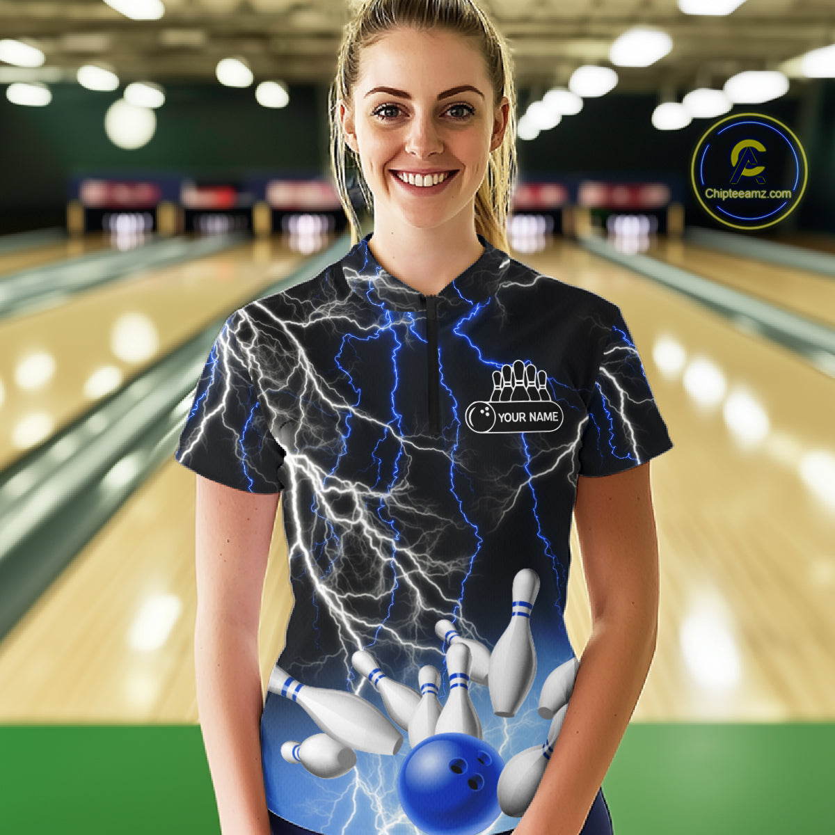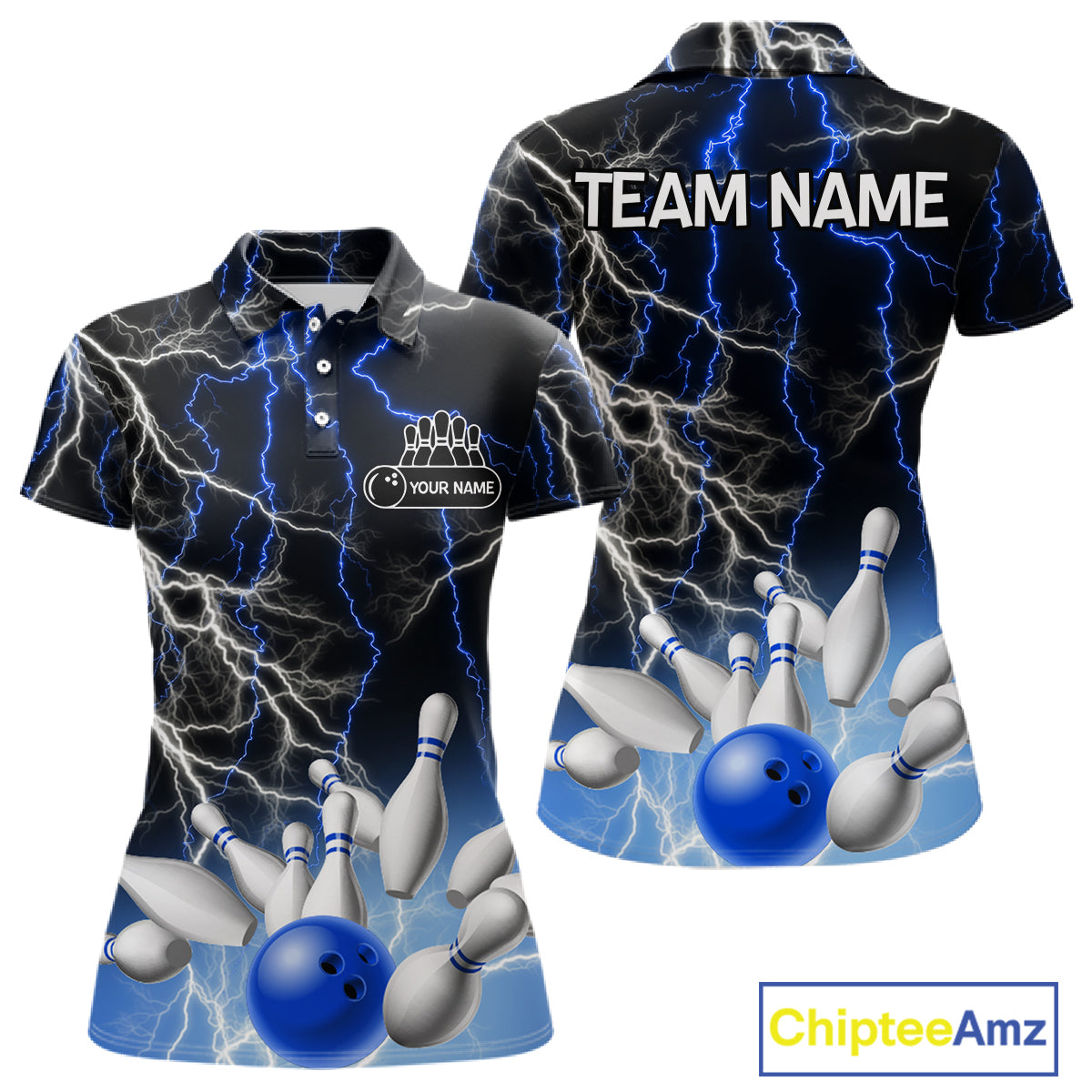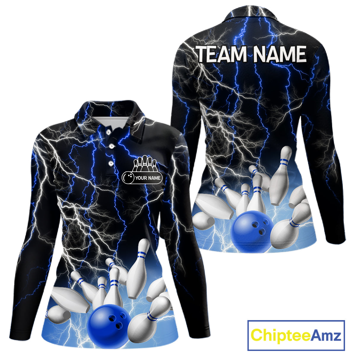 Women's bowling Polo, Quarter Zip shirts Custom Blue lightning thunder team bowling league jerseys NQS11261