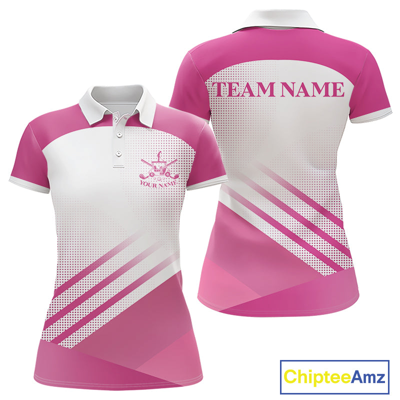 Womens Golf Polo Shirt Custom Pink And White Pattern With Golf Cart Golf Ball Shirts For Women NHN0059