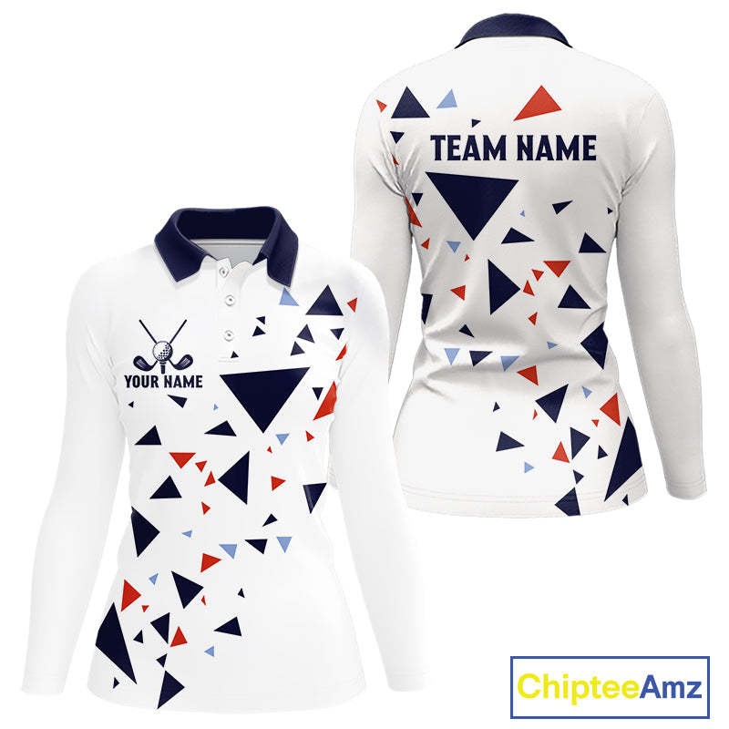 Womens Long Sleeve Golf Polo Shirt Custom Orange & Blue Triangle Pattern Team Golf Tops, White Golf Attire NHN0086