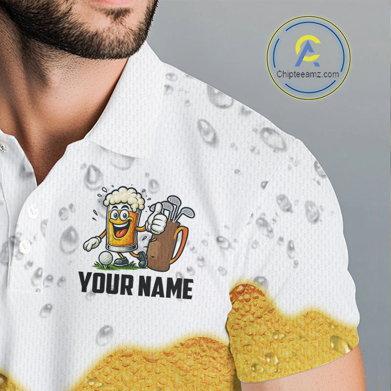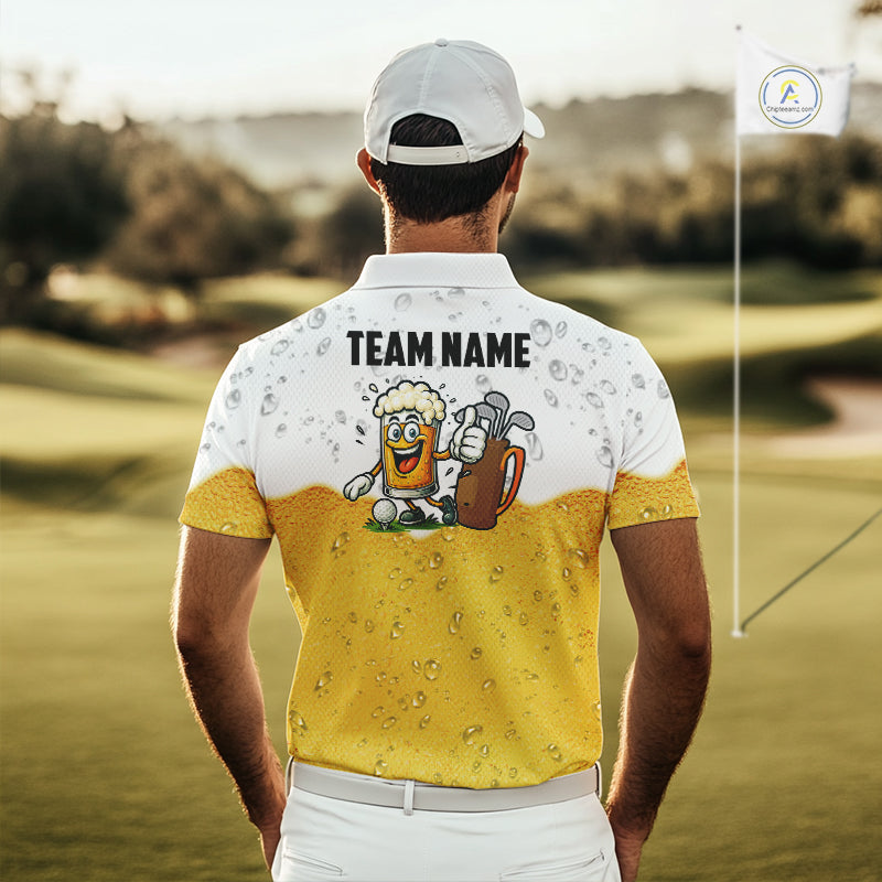 Custom White And Yellow Funny Beer Golf Polo Shirts For Men, Funny Beer Glass Mens Golf Outfit NQS10919