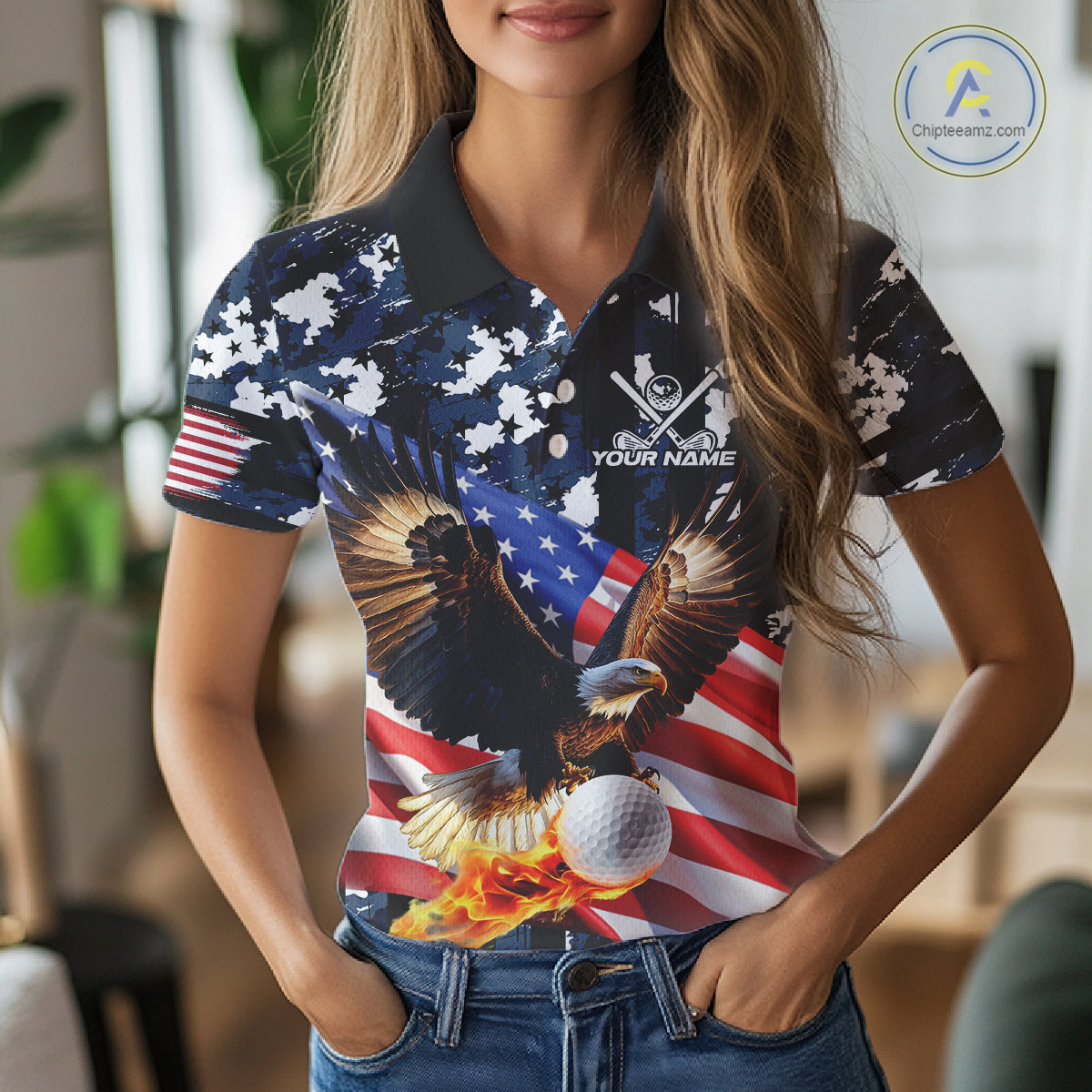 Blue Camo American Flag Eagle Flame Women Golf Polo Shirt Custom Patriotic Team Ladies Golf Outfit NQS10552
