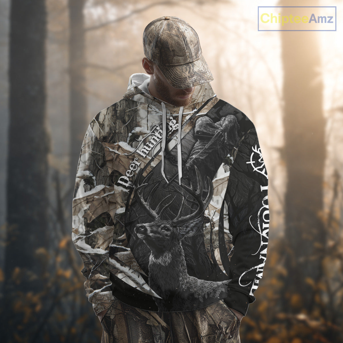 Custom 3D Deer Hunting Shirt With Black Deer Grim Reaper Winter Camo For Deer Hunting Season NHT74
